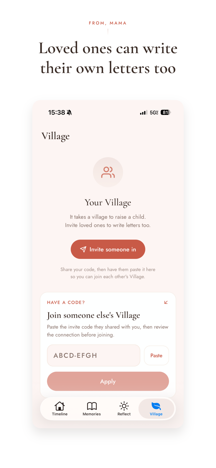 It takes a village to raise a child. Invite grandparents, partners, and loved ones to join your Village and contribute their own letters. One child. Many voices. A legacy written by everyone who loves them. Just imagine how special your children will feel when they can look through years worth of letters written for them by all of those involved their upbringing.