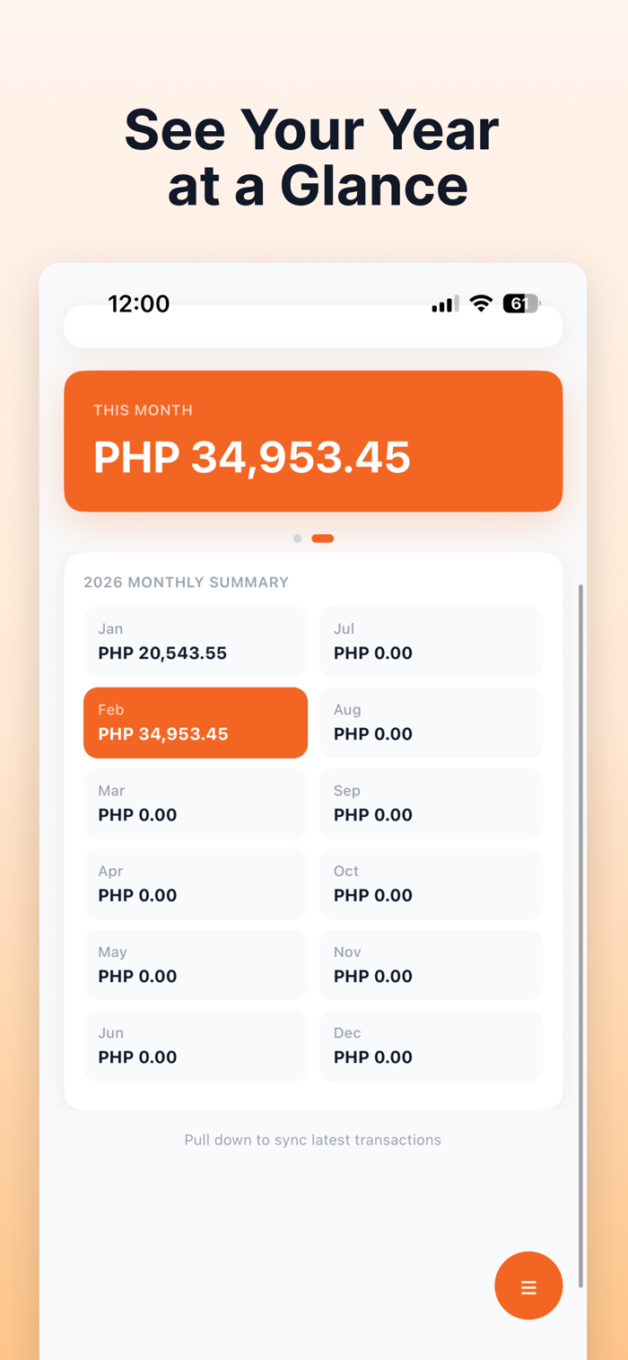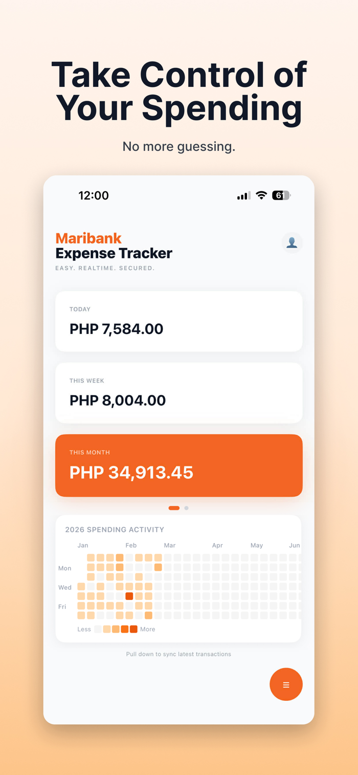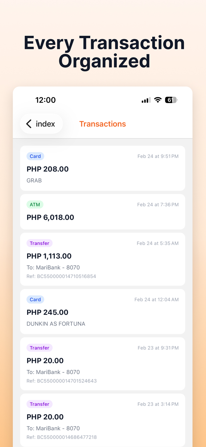 Connect your Gmail account with read-only access. The app finds your MariBank and SeaBank transaction emails and securely extracts your spending information. Card purchases, ATM withdrawals, and fund transfers are organized instantly.