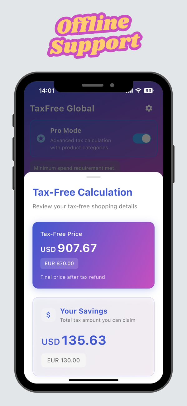 Tax Free Global能以你偏好的货币显示最终免税价格及潜在节省金额。其核心功能包括即时免税价格计算、实时货币转换、清晰的节省明细分解及离线功能。适合想确切知晓在国外购物支付与节省情况的国际购物者和旅行者,只需输入购买金额,就能看到以你货币计的最终免税价格及潜在退款,告别猜测。