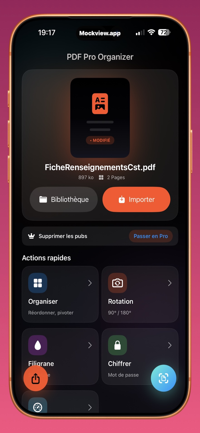PDF Pro Organizer可帮您整理PDF文档,实现合并、拆分,高质量压缩,添加自定义水印,密码保护文件,能从文件、照片或扫描仪导入,界面现代流畅且操作快速,支持离线使用,专为iPhone和iPad优化,处理大文件流畅,注重隐私,文档仅存于本地设备,不上传外部服务器,还具备多语言特性,助您专业管理文档。
