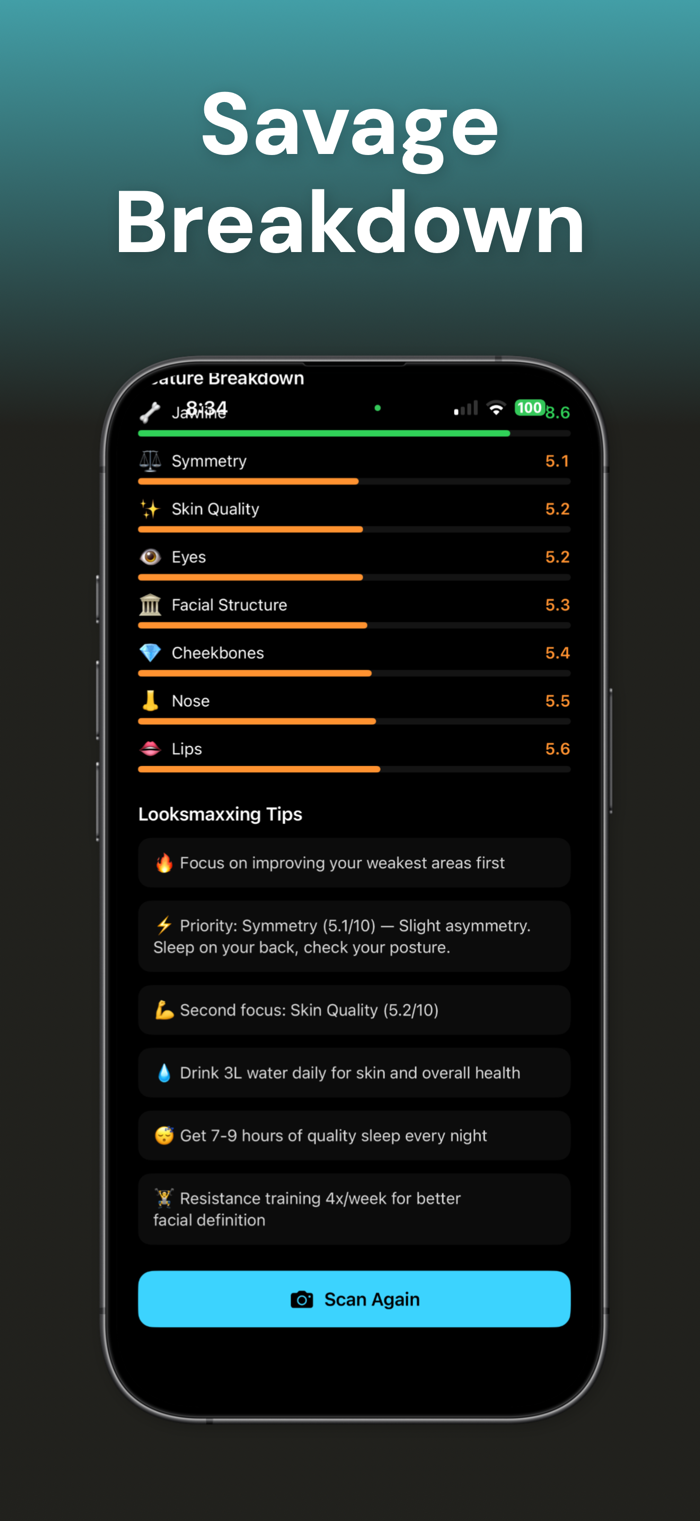 - Detailed breakdown of jawline, symmetry, eyes, skin & more*