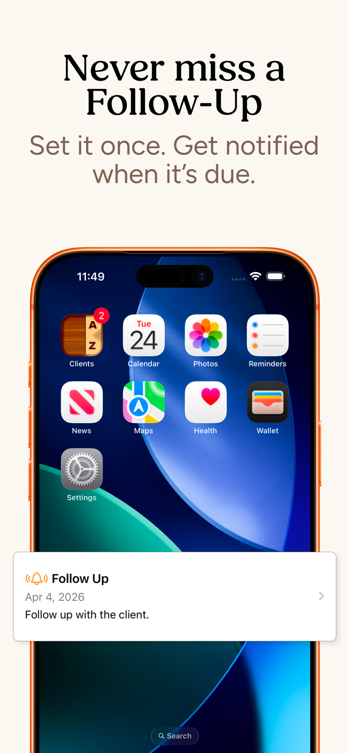 Set a follow-up from any conversation. It stays attached to the client, not buried in a to-do list.