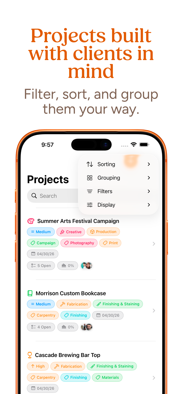 Most apps keep your clients in one place and your work in another. Clients links them. Every client has their own project list, conversation history, notes, and follow-up reminders, so the context you need is always one tap away.