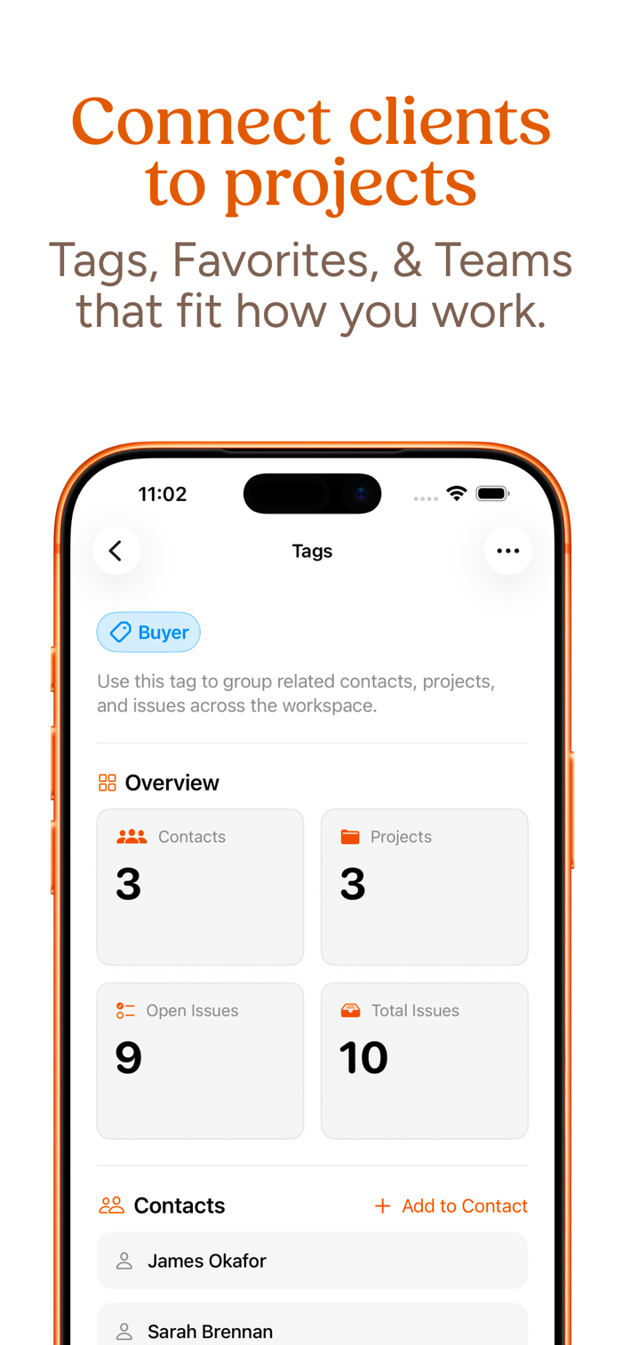 Clients is a native iPhone and Mac app that connects your contacts, your notes, and your projects in one app. Your client history and notes, your active projects, and your follow-ups all live together, so you always know a client's status before you pick up the phone, go into a meeting, or send that email.