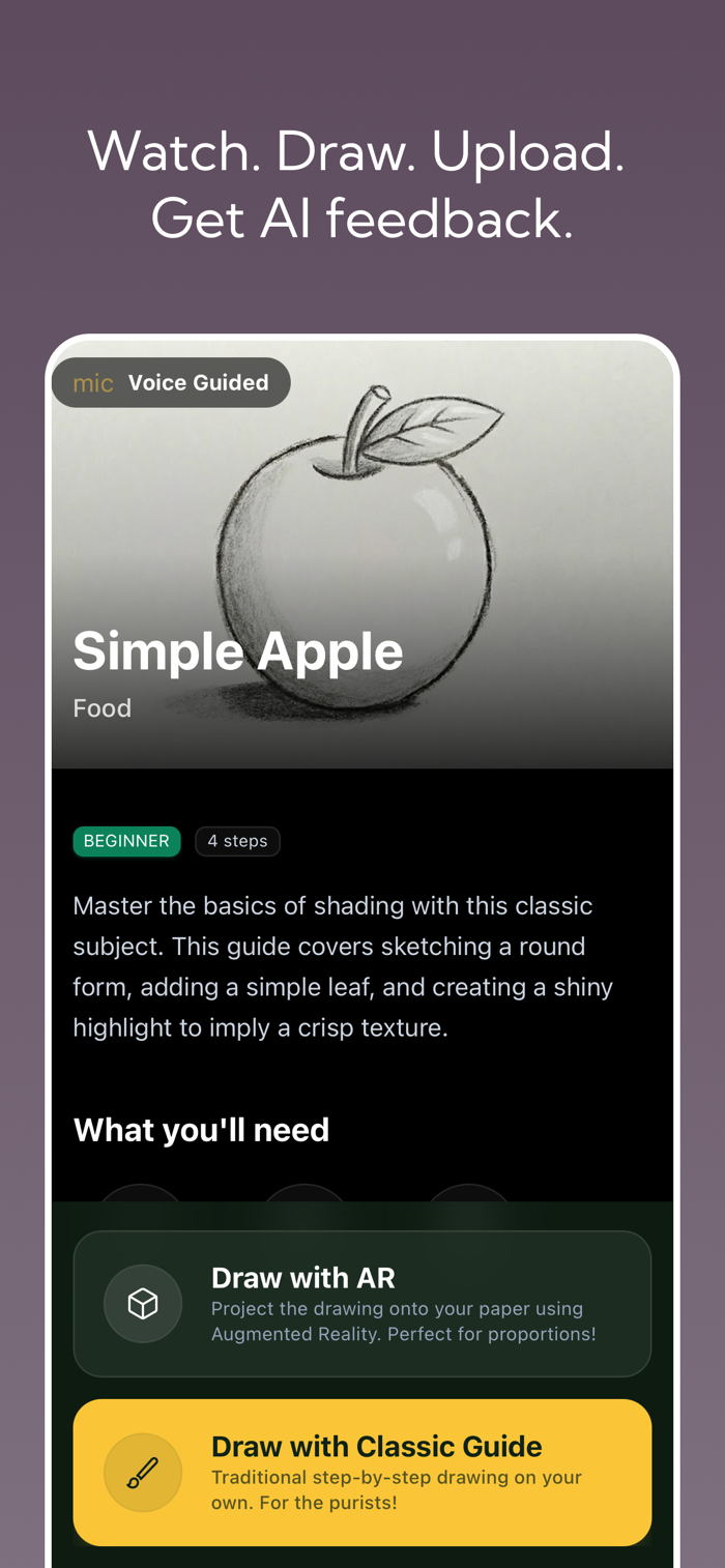 Guidart是一款引导式绘画应用程序,通过结构化课程、每日练习和清晰的进展帮助用户学习绘画,现新增可选的增强现实(AR)绘画模式。用户可先通过免费绘画选择探索应用,订阅后能解锁完整绘画旅程、高级分步课程、AI反馈、AR绘画模式和全球排行榜。特色功能包括分步绘画课程(部分免费,完整访问需订阅)及每日绘画练习,支持按经典屏幕指导或AR模式以现实世界对齐方式绘画,完成作品后上传可获AI反馈以了解如何改进。
