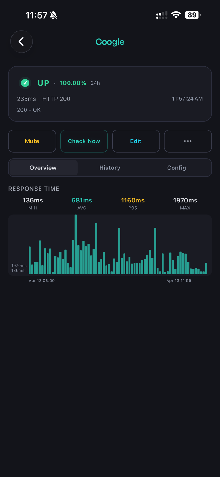 Run HTTP, DNS, TCP, ICMP, and TLS certificate checks directly from your phone. Monitor servers, websites, APIs, and local network devices. Your phone becomes an edge monitoring node — check services from your actual location, not a remote datacenter.
