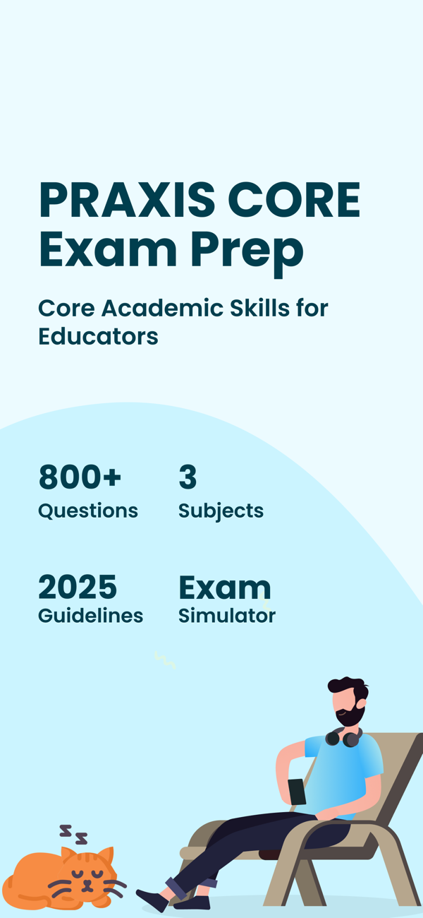 Disclaimer: This Praxis Core prep app is an independent study resource and is not affiliated with, authorized by, or endorsed by any exam owner, publisher, or administrator. Praxis Core and all related trademarks are the property of their respective owners. Names are used only to identify the exam.