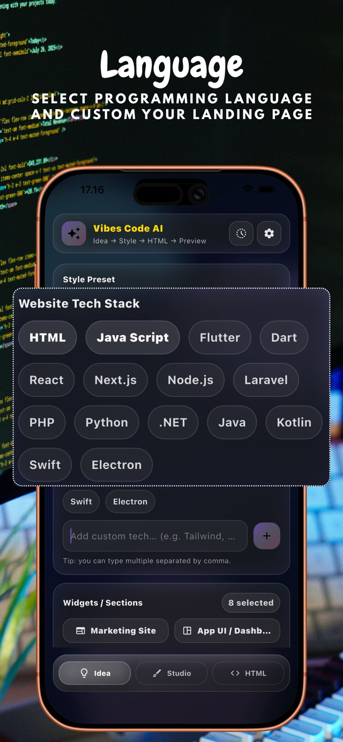 Craft smarter website prompts using presets, style themes, tech stack selection, and modular widgets (hero, pricing, FAQ, dashboard, forms, and more).