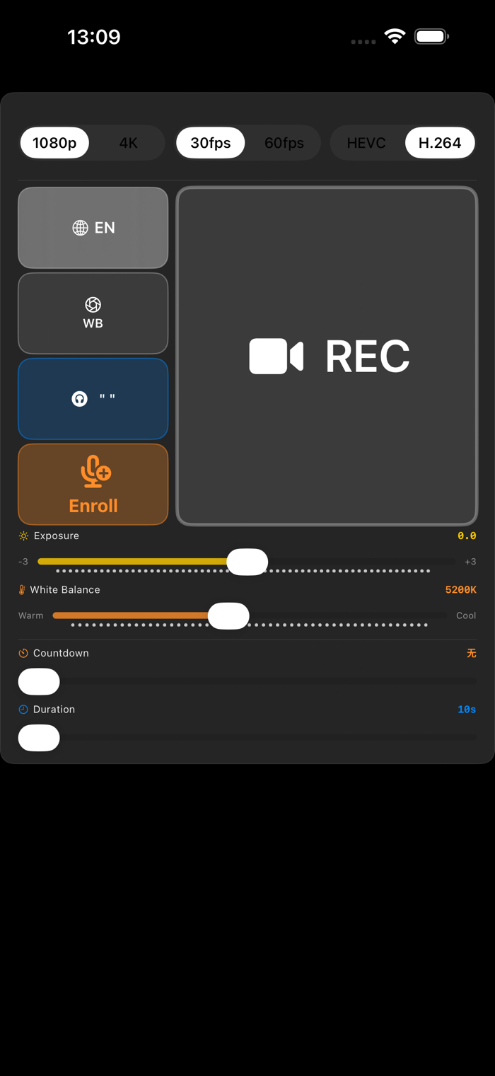 软件用于在场地练习时拍摄动作视频用于纠正动作,软件分4个独立的功能, 1 手动启动录像功能(最大的按钮),可设置录制时长和延迟录摄时间,最长可录制20秒时间,最长可延迟10秒开始录制。2 具备语音识别(橙色按钮),当录入“开始拍摄”声纹后,可以通过声纹控制开始录制。3 通过苹果自带蓝牙耳机控制录制(点击蓝色按钮激活),当蓝牙耳机连接手机后,点击蓝色按钮激活功能,通过耳机按钮短按后可启动录像功能。4通过设定识别颜色并设置识别区域,可自动录制视频