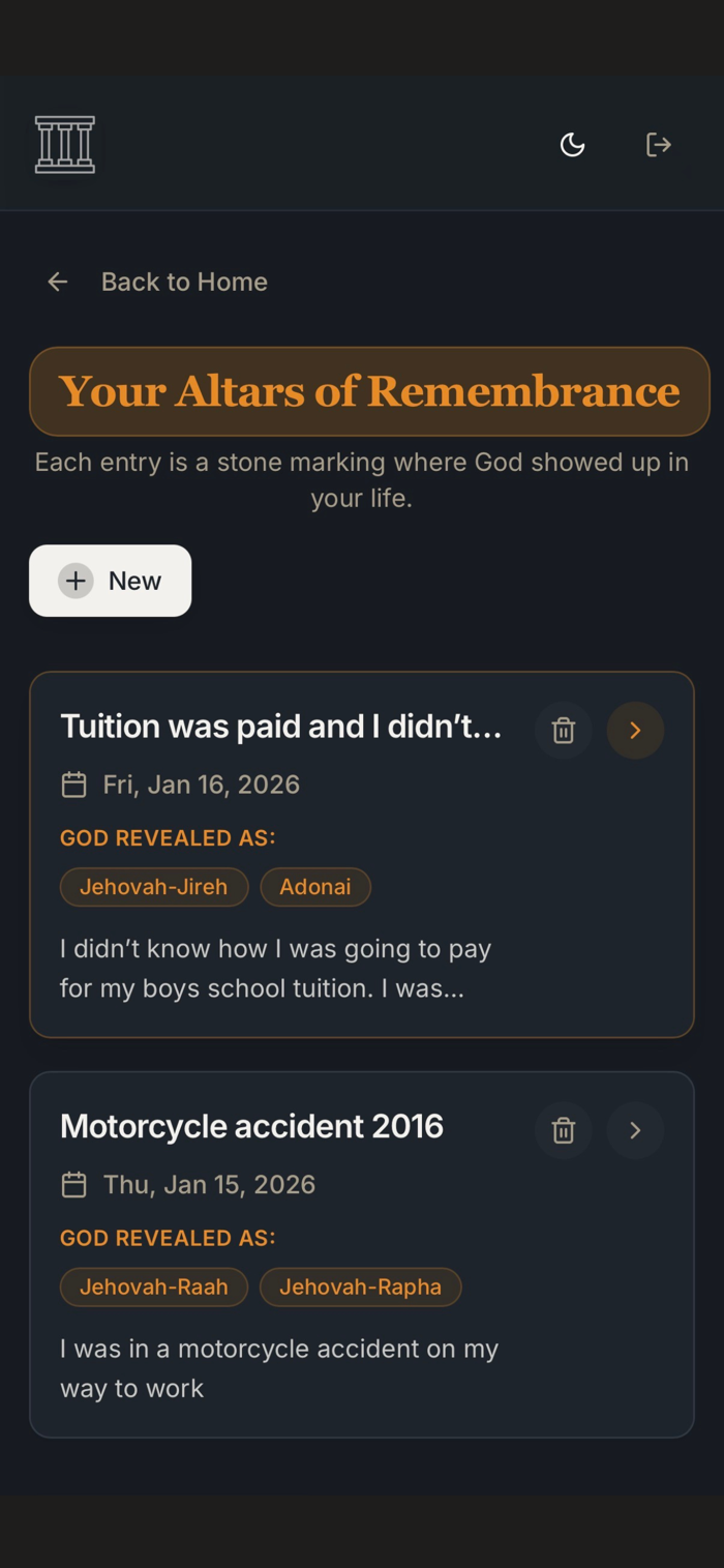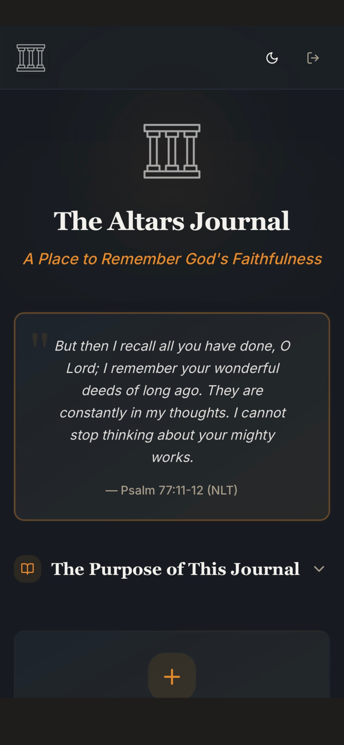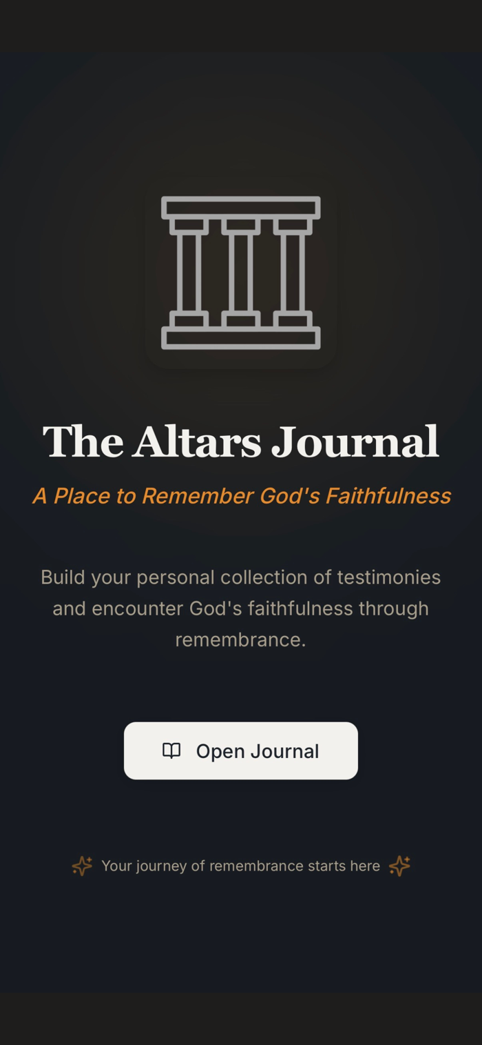 The Altars Journal helps document God's faithfulness. Record challenges, relevant names of God, and His manifestations. Create personal "altars of remembrance". Features include creating journal entries with dates, titles, and detailed reflections, selecting from meaningful God names, adding photos, locking important entries, and offering a beautiful distraction-free writing experience.