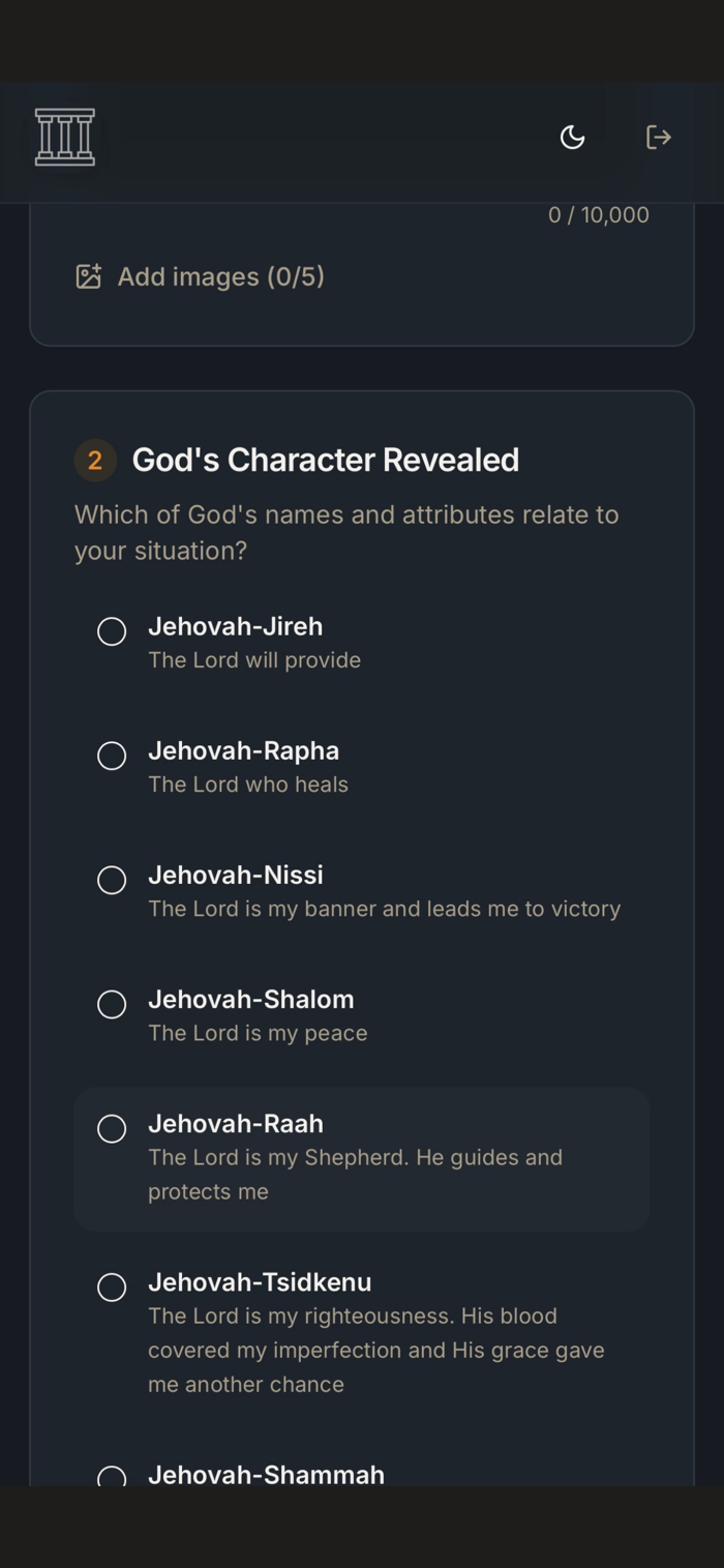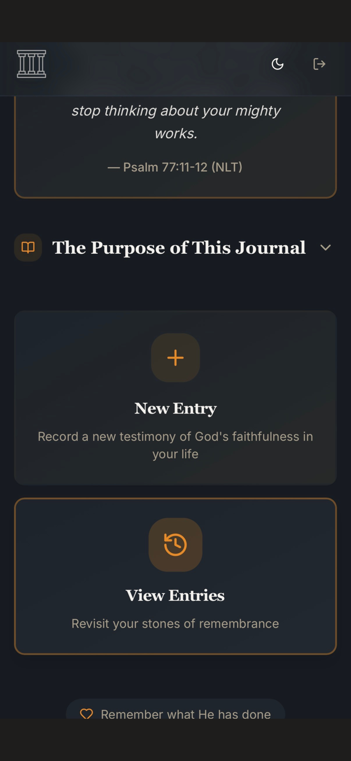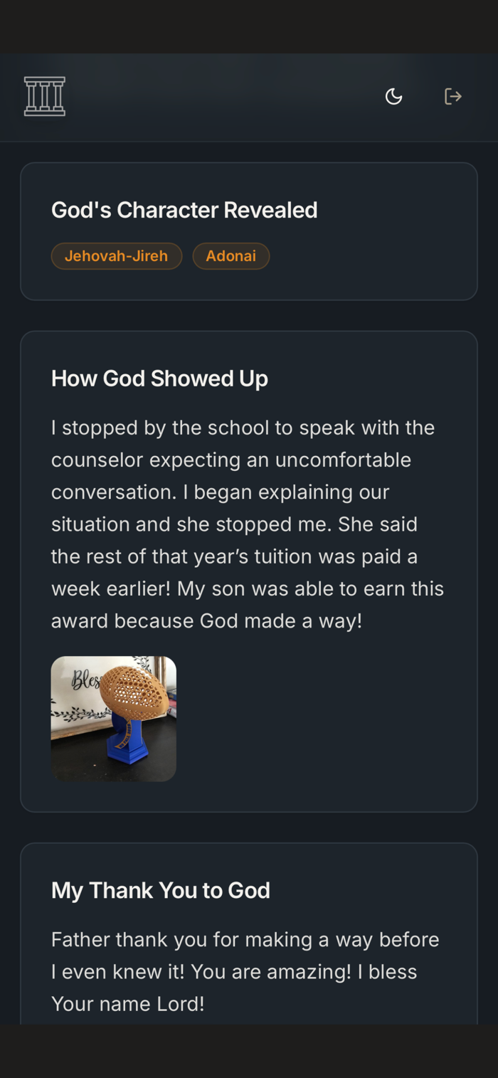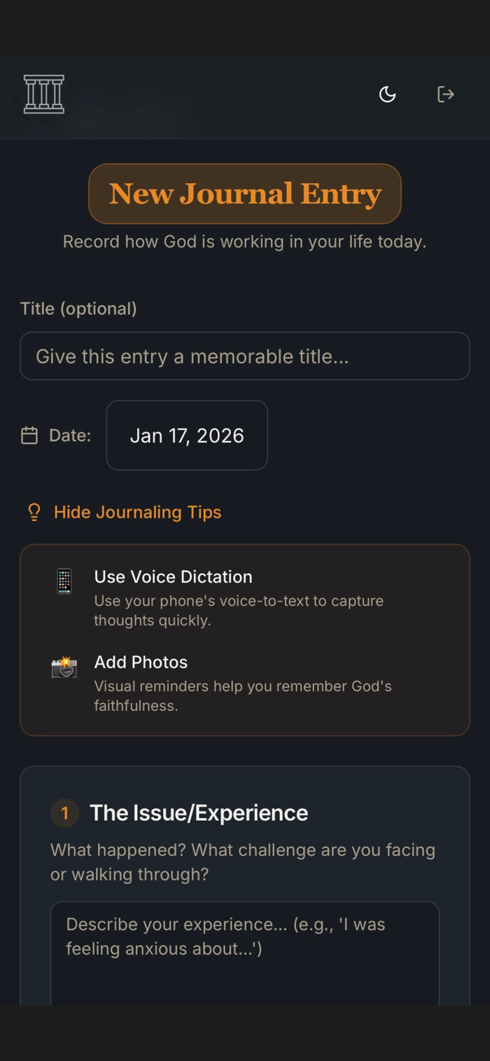 The Altars Journal helps document God's faithfulness. Record challenges, relevant names of God, and His manifestations. Create personal "altars of remembrance". Features include creating journal entries with dates, titles, and detailed reflections, selecting from meaningful God names, adding photos, locking important entries, and offering a beautiful distraction-free writing experience.