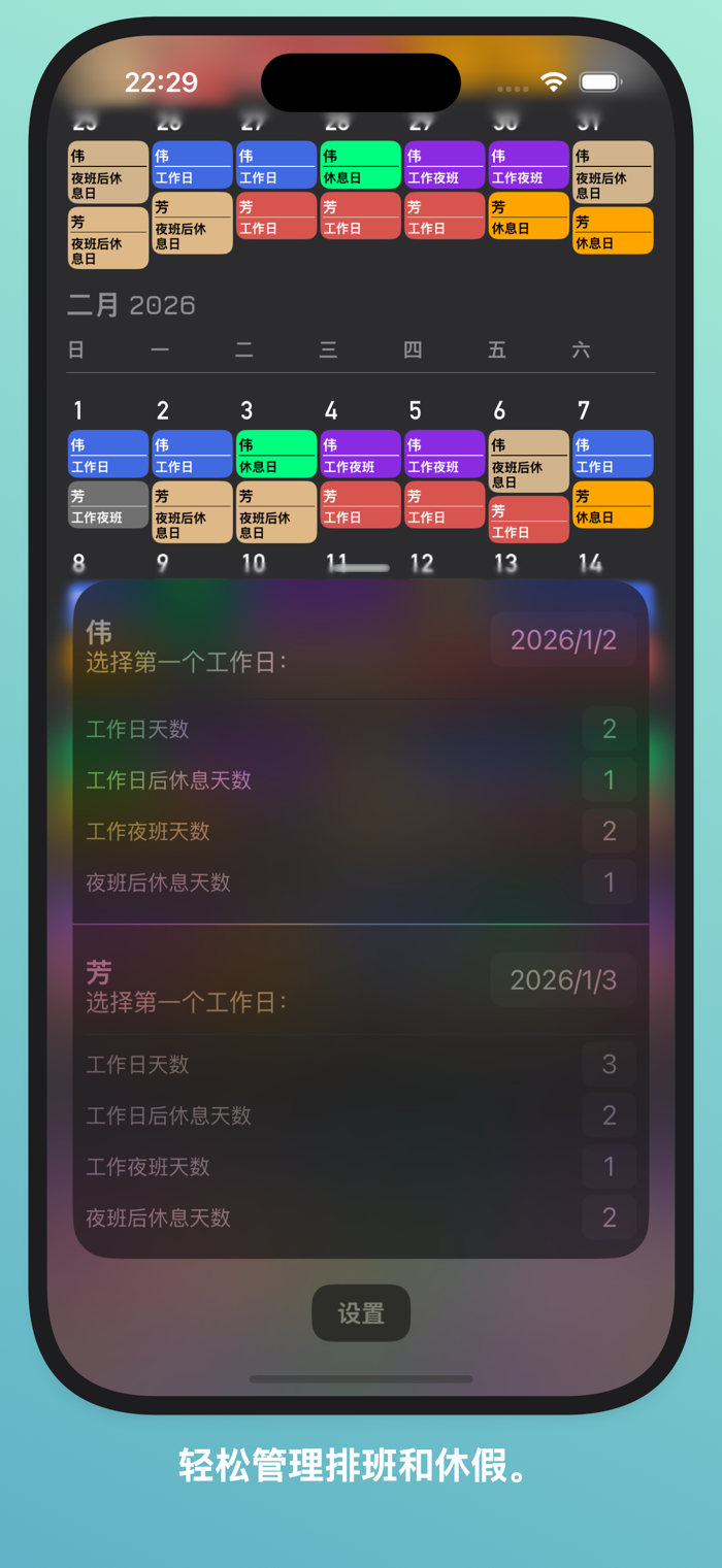 • 自定义班次: 定义每个月每天的工作时间表。输入具体的白班或夜班(或任何时段),并按需编辑。
