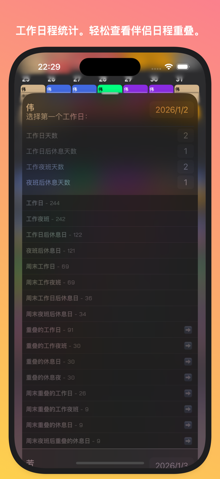 • 日程比较: 轻松比较日程安排。找出你们何时在同一天工作,或何时你们同时休息。突出显示重叠的工作时间或空闲时间,让规划变得轻而易举。