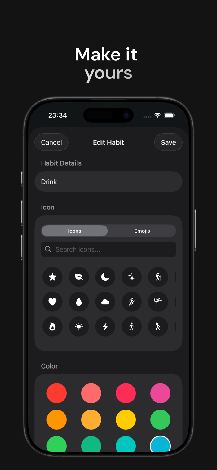 Unlimited customization: choose from hundreds of icons, pick any color, set flexible goals. Track daily meditation or 10 glasses of water - HabitBit adapts to you.