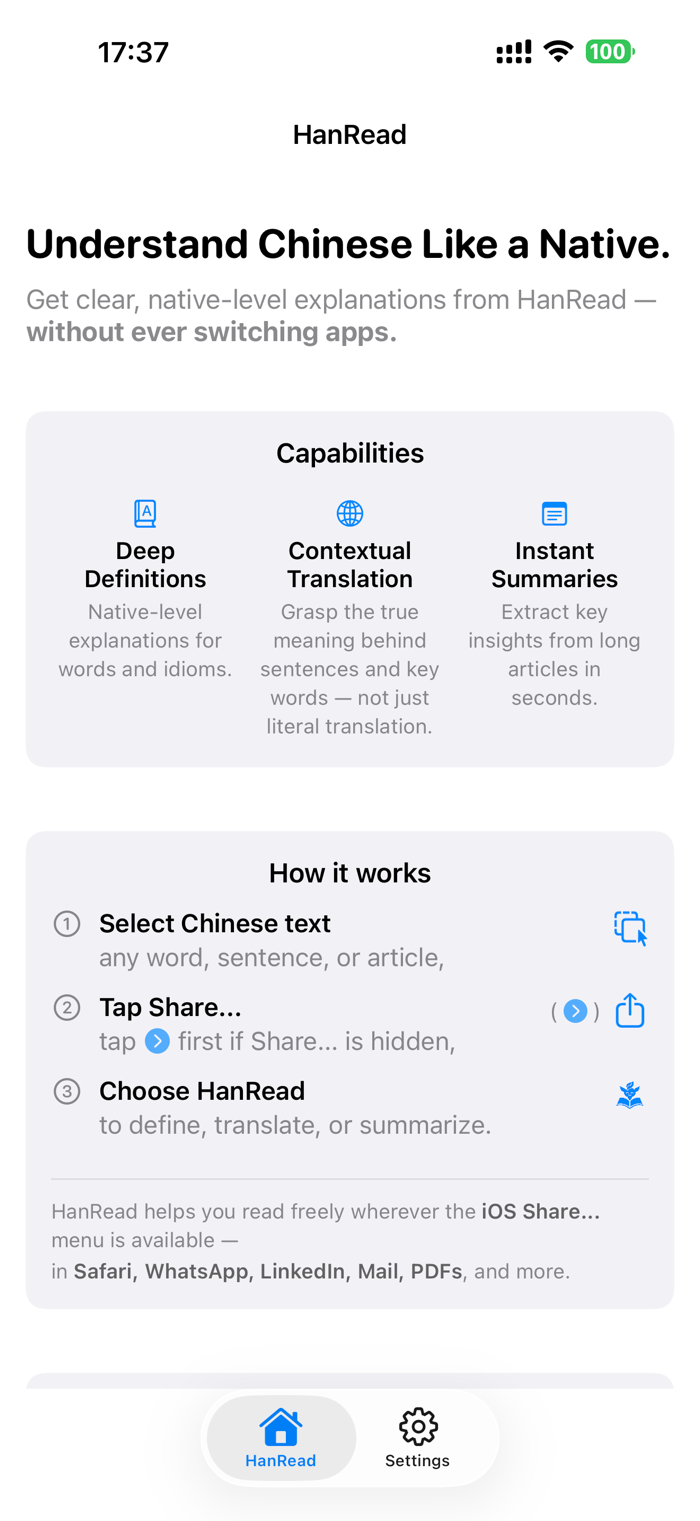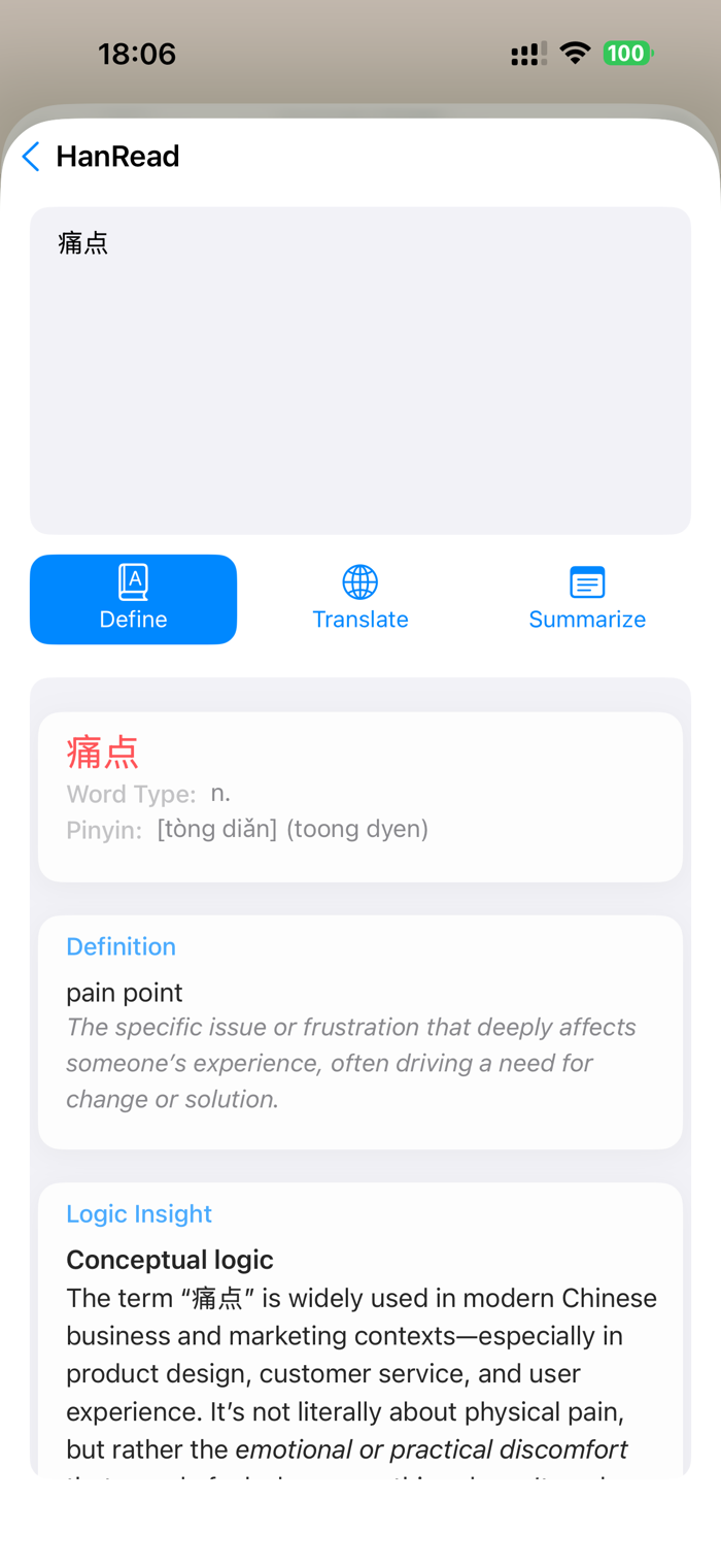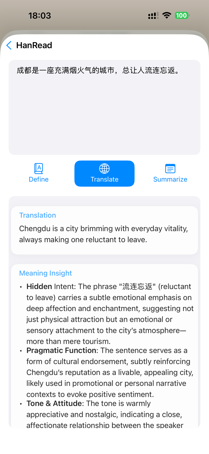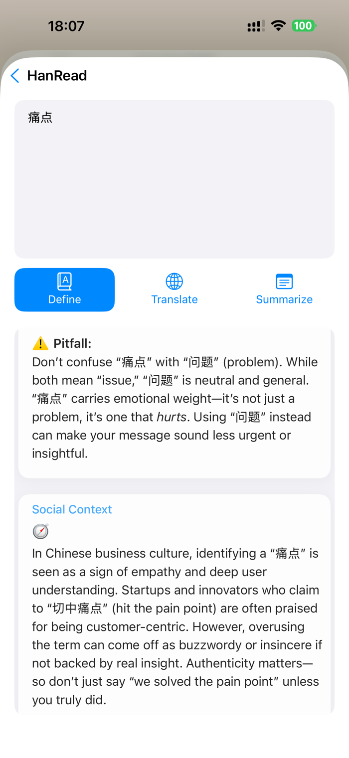 HanRead 不仅是词典或翻译工具,能解码中文表达在语境中的真实含义。可助您理解词汇、习语、俚语等,提供文化背景解释与用法示例,还能总结复杂段落。支持在 Safari 或任何应用中选文本分享至 HanRead,也能直接粘贴文本探索。界面简洁无 clutter,专为需理解含义而非仅翻译的学习者和专业人士打造,解锁全部功能需订阅,有月/年计划,新用户可免费试用。