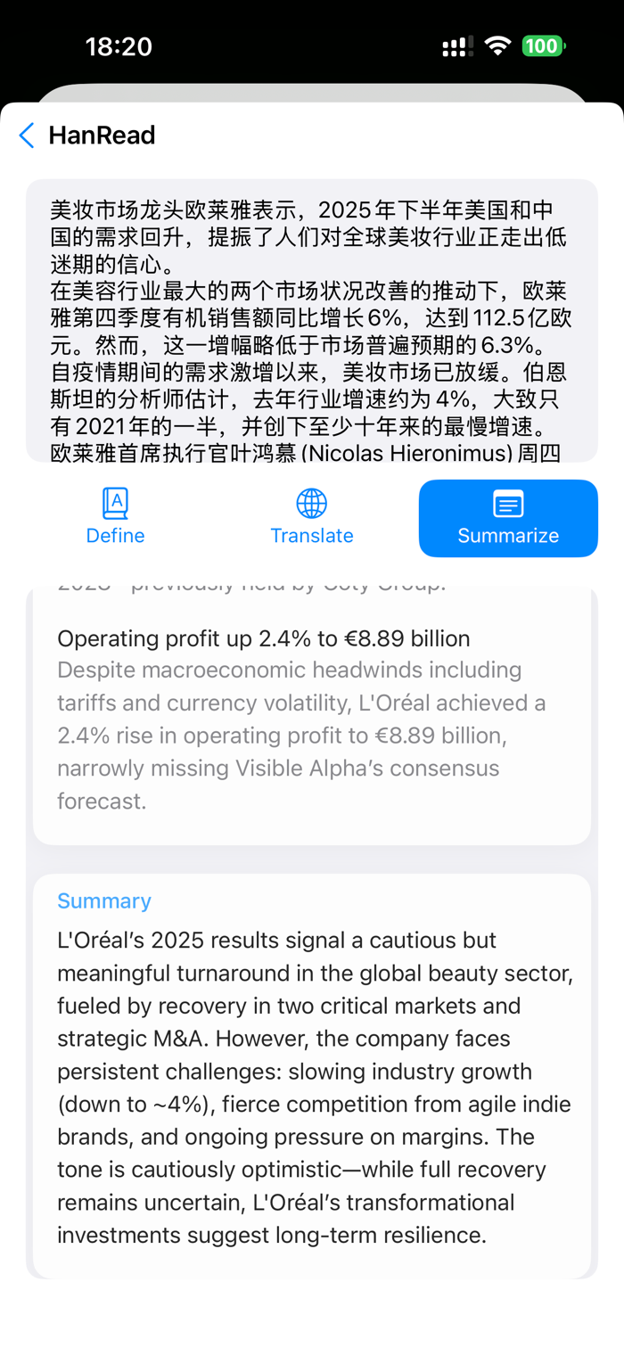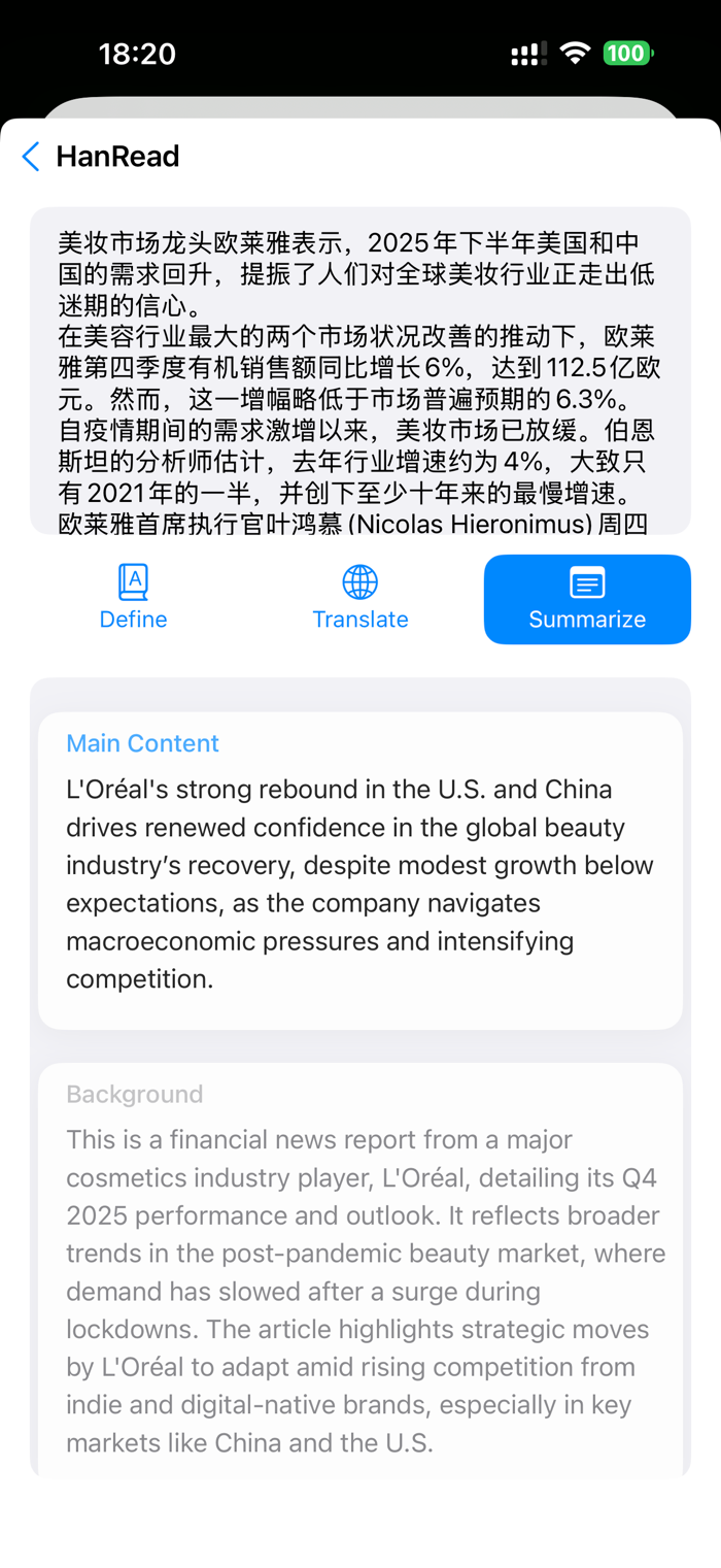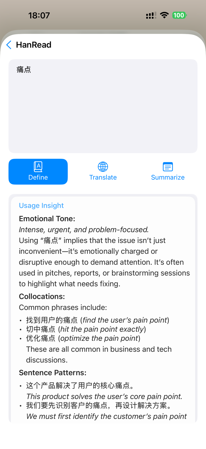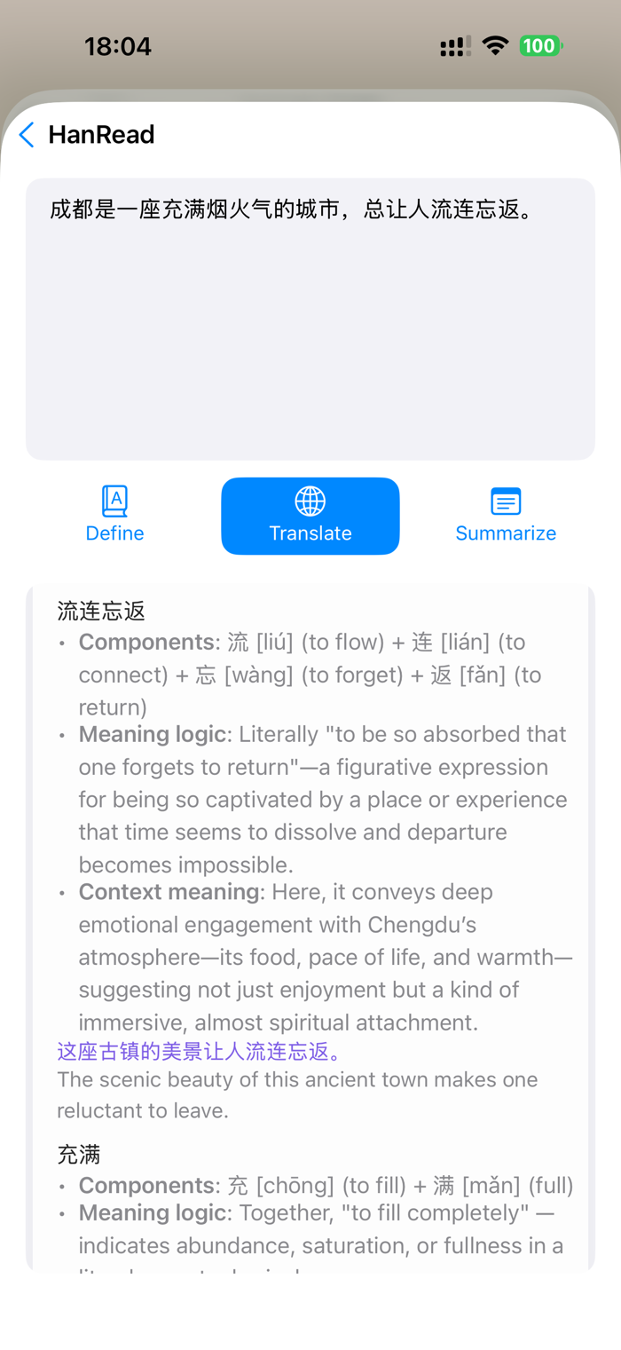 HanRead 不仅是词典或翻译工具,能解码中文表达在语境中的真实含义。可助您理解词汇、习语、俚语等,提供文化背景解释与用法示例,还能总结复杂段落。支持在 Safari 或任何应用中选文本分享至 HanRead,也能直接粘贴文本探索。界面简洁无 clutter,专为需理解含义而非仅翻译的学习者和专业人士打造,解锁全部功能需订阅,有月/年计划,新用户可免费试用。