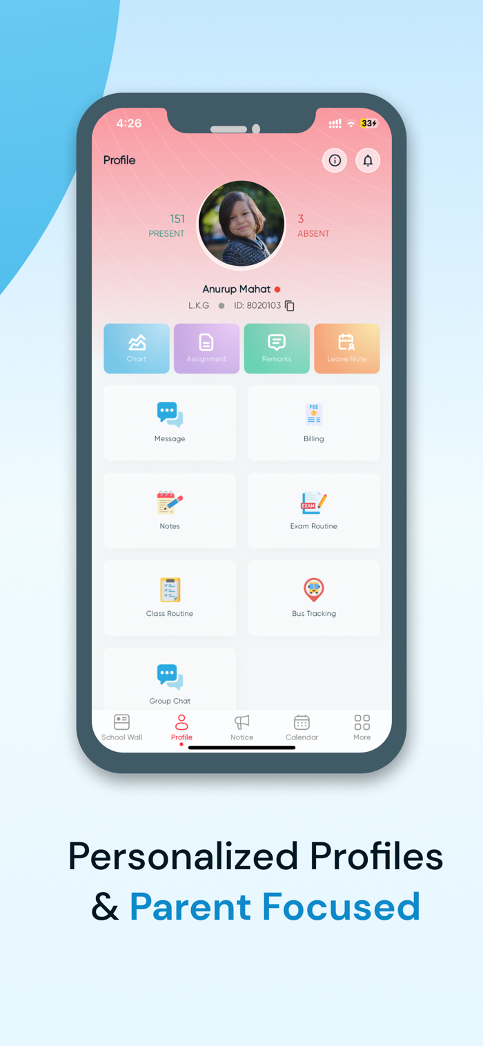 Additional features include push notifications for any event such as attendance, remark and school notices.