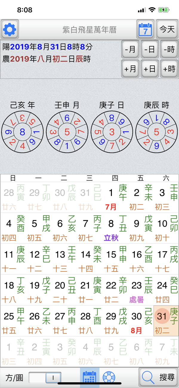 紫白飞星是一个「风水布局」专用的工具,可以详细列出「年、月、日、时」的紫白飞星九宫图,并提供紫白飞星条件式搜寻,更多功能如下: