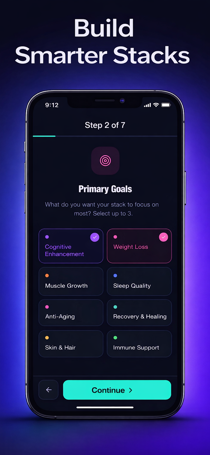The stack builder lets you construct and manage multi-compound research protocols from scratch. You can set dosages, frequencies, timing, cycle durations, and ramp-up or taper phases for each compound in a stack. Once configured, the app tracks your active cycle and displays which phase you are in at any given time. Notes can be added at the stack or compound level so your observations stay organized alongside your protocol.