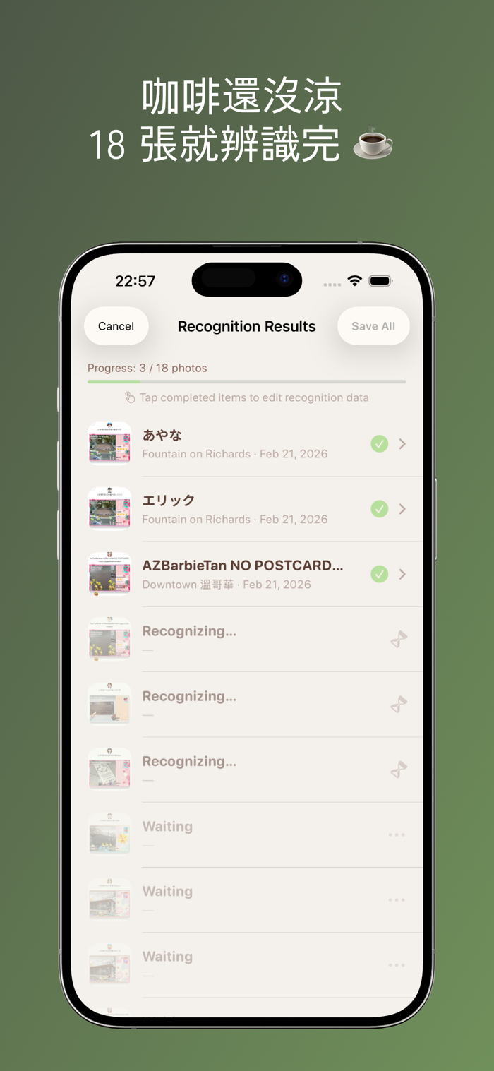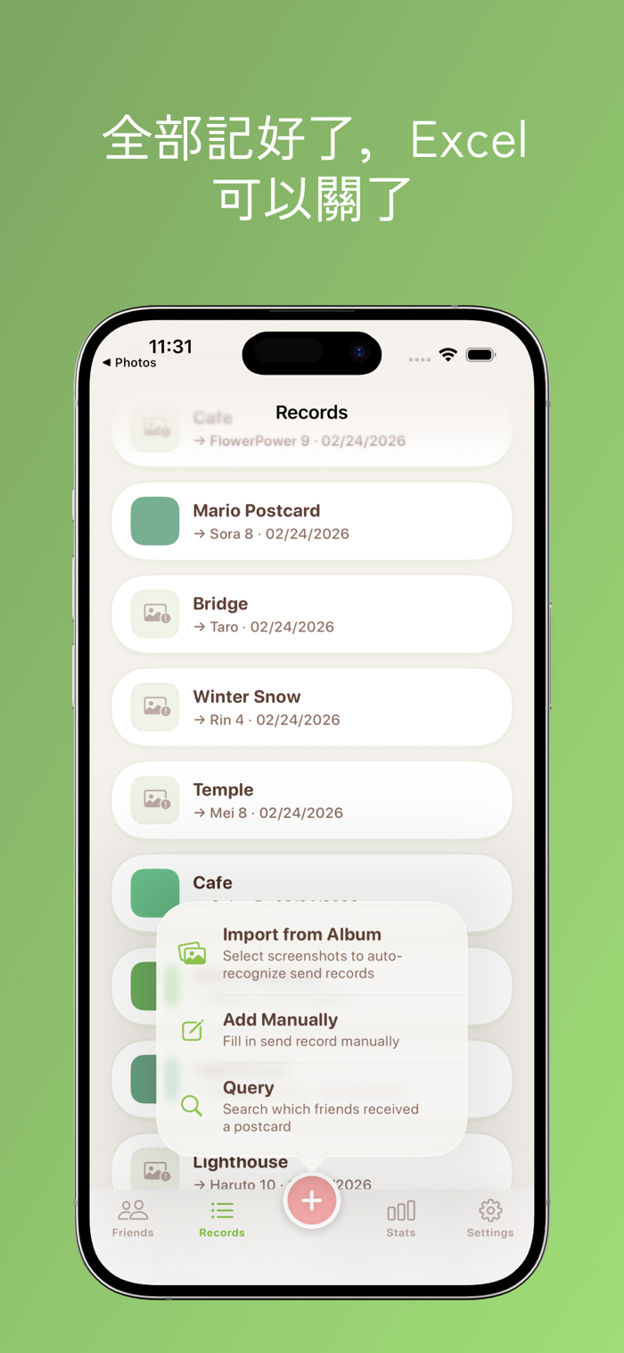 從相簿分享截圖,OCR 自動辨識好友名稱、明信片、日期。一次最多 20 張,批次匯入不手軟。辨識錯了?點一下手動改,五秒解決。
