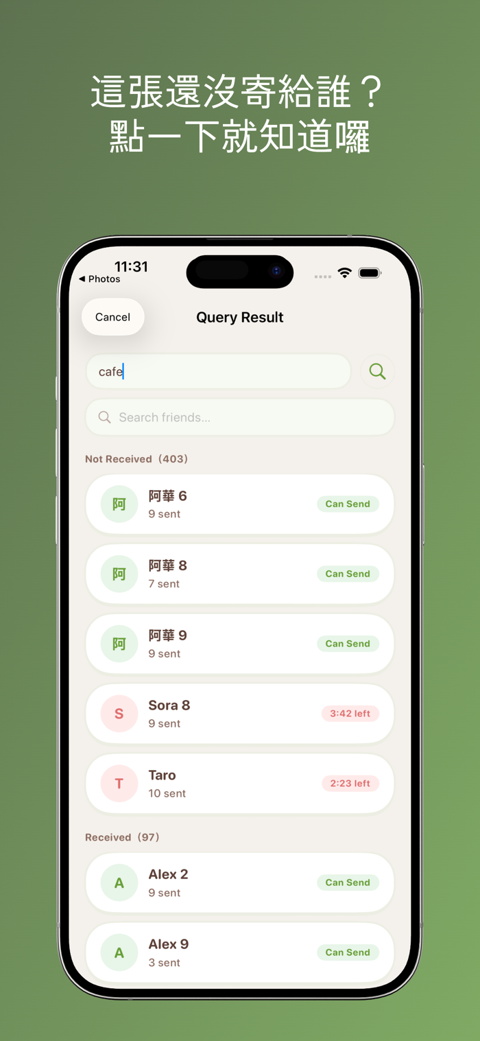 分享截圖進來,秒查全好友名單:「未收過」排前面,可寄送的再優先——效率最大化,沒有漏網之魚。