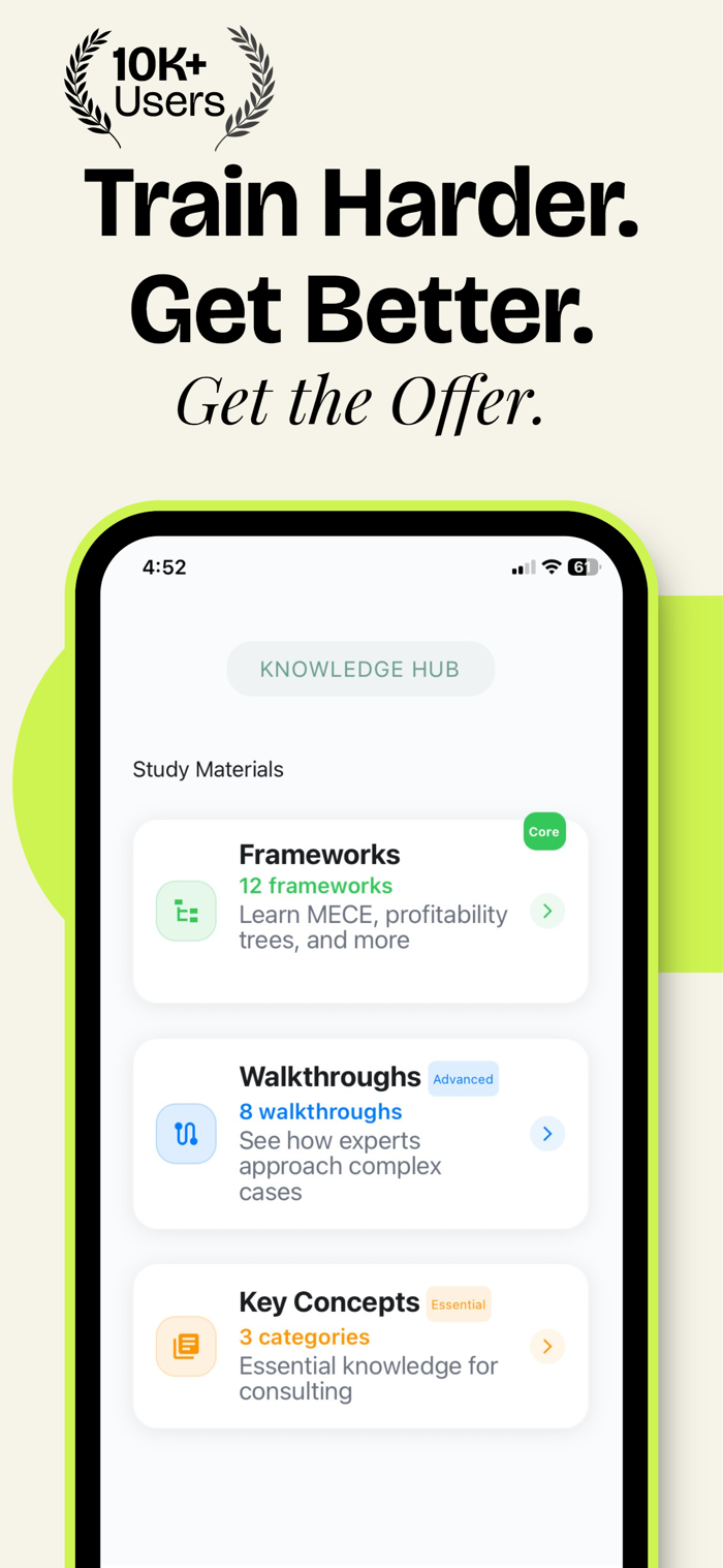 CaseXcel是一款专业的案例面试准备应用程序,面向麦肯锡、波士顿咨询集团、贝恩、普华永道和德勤等顶级咨询公司的求职者。它能训练面试官测试的结构化思维、心算、清晰沟通和实际案例问题解决等技能。涵盖心算、咨询框架应用、结构化头脑风暴、全案例面试练习等,通过逐步演练模拟真实面试,还有智能进度跟踪,帮助求职者学会应用框架而非死记模板,提升MECE思维与结构化推理能力,增强在压力下的信心。