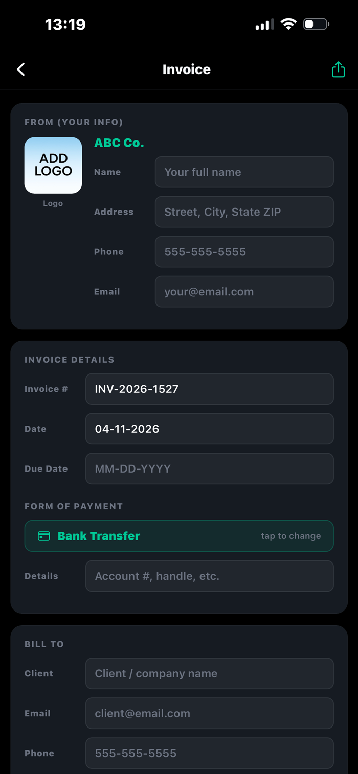 Generate and share clean, branded pay stubs as PDFs — right from your phone. Perfect for loan applications, rental verifications, and client records.
