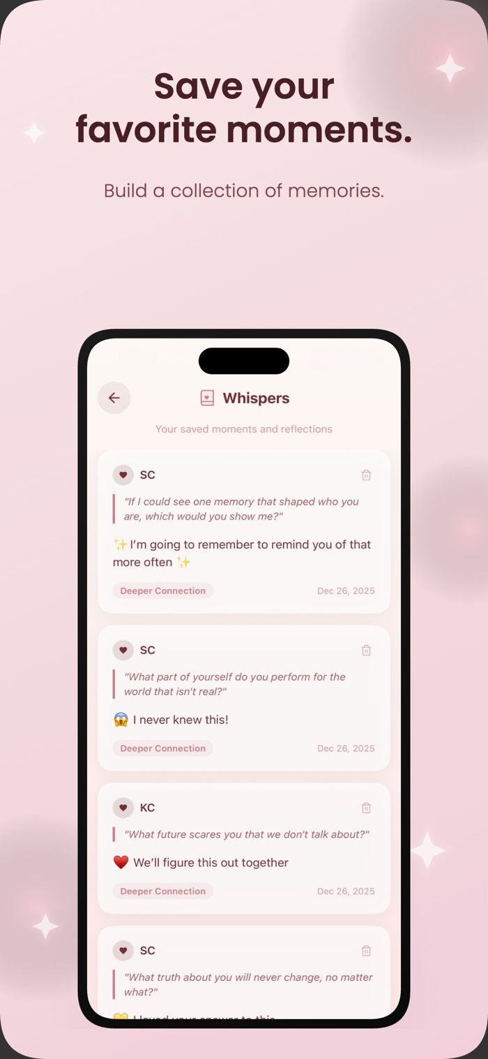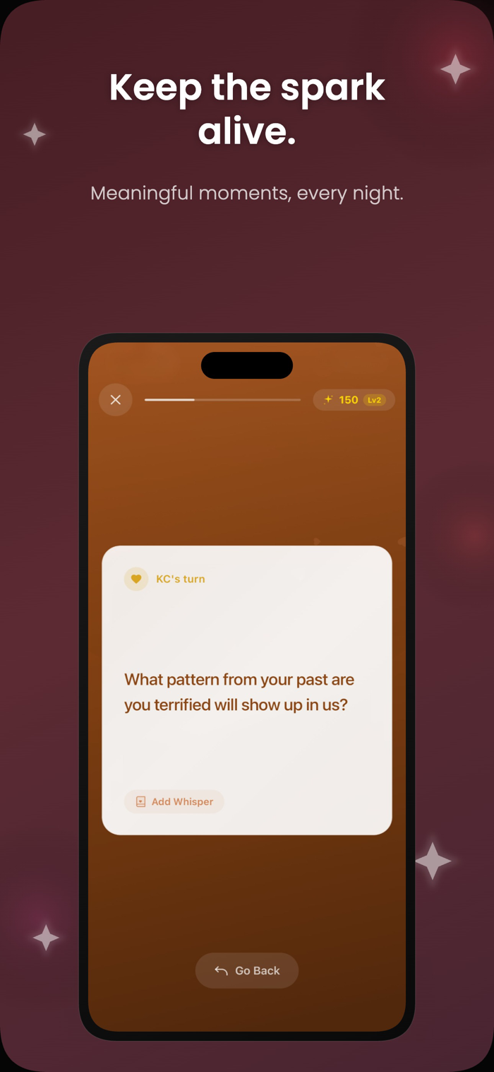 Date Night是一款情侣问答应用,能将任何夜晚变成深度对话。有数十个精心策划的问题库,涵盖从趣味开场白到深层关系的问题。可根据今晚氛围选库,让话题引导交流。话题覆盖共享历史、未来梦想等多方面,每张卡片都是助力情侣真诚沟通的话题引子。能在私密答案收藏Whispers中保存美好时刻。免费开启,解锁完整卡片游戏集可继续使用。