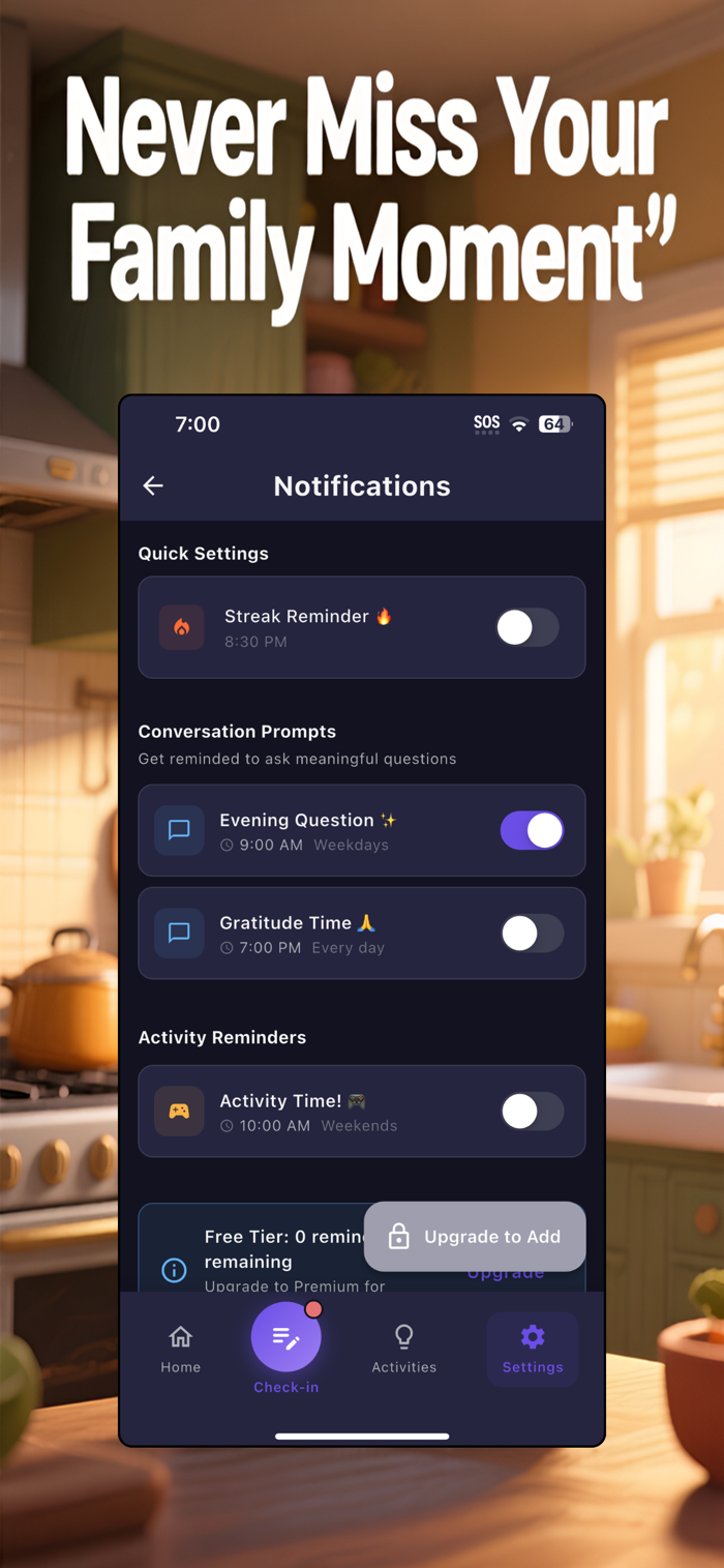- Evening check-in reminder (7:00 PM)