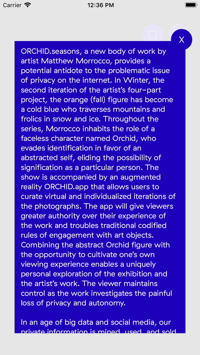 艺术家马修·莫罗科的新作《兰花的四季》,为互联网隐私这一棘手问题提供了一种可能的解决之道。在该艺术家四部分项目的第二部分《冬季》中,橙色(秋季)的形象变成了一个冷峻的蓝色形象,它翻山越岭,在冰雪中嬉戏。在整个系列中,莫罗科饰演一个名为兰花的无脸角色,这个角色避开身份识别,转而追求一种抽象的自我,回避作为特定个体的表意可能性。展览配有一个增强现实应用程序《兰花应用》,用户可以通过它策划照片的虚拟个性化版本。该应用程序将赋予观众对作品体验更大的自主权,并对传统的艺术观赏既定规则提出挑战。将抽象的兰花形象与培养个人观赏体验的机会相结合,能让观众对展览和艺术家的作品进行独特的个人探索。当作品探讨隐私和自主权的痛苦丧失时,观众保持着控制权。