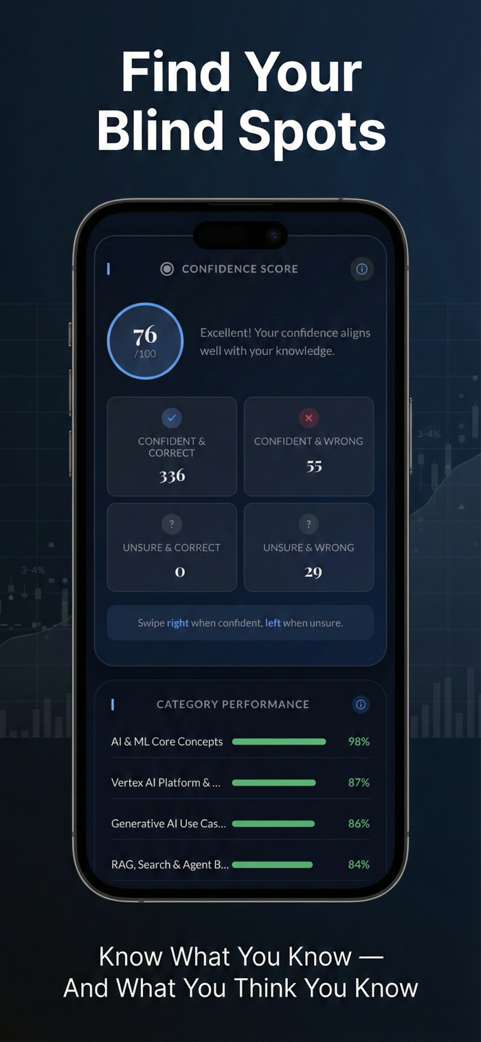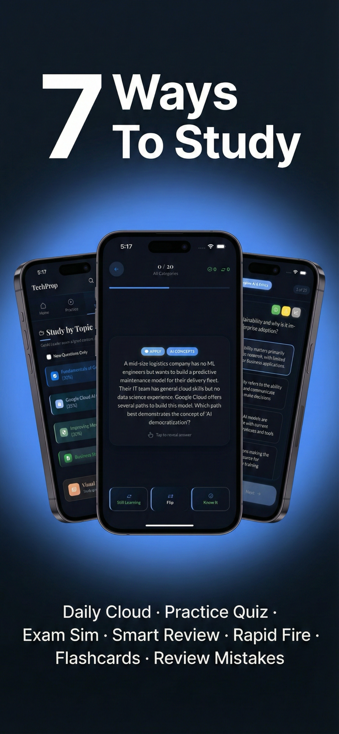 The Google Cloud Certified Generative AI Leader exam tests your understanding of AI fundamentals, Google Cloud offerings, prompt engineering, and enterprise AI strategy. TechPrep helps you prepare with a science-backed study system built on cognitive science research.