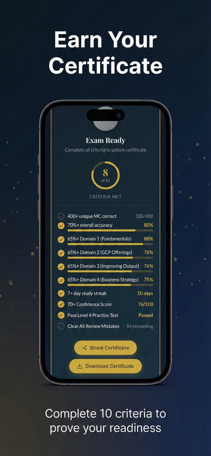 Earn your Exam Ready Certificate by meeting all 10 readiness criteria. Take the Google Cloud GenAI Leader exam within 14 days. Pass or get a refund of your most recent subscription payment. Available on all Pro plans.