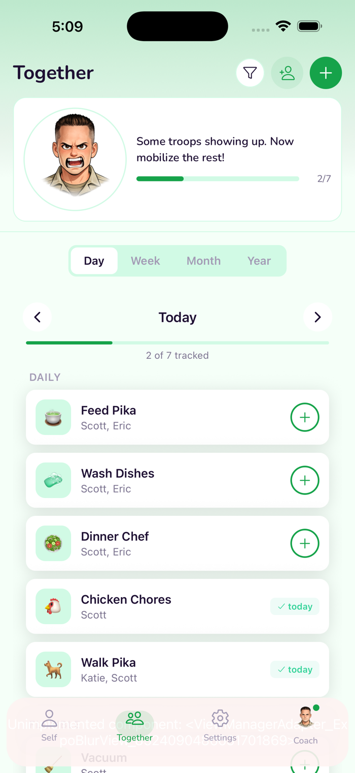 Invite your partner, family, or friends to shared tracks. See who completed what, react with emojis, and keep each other motivated. Track chores, workouts, date nights, reading goals, savings — anything you do together. Add household members who don't need their own account.