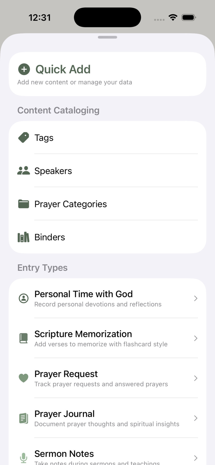 Find entries by text, tags, speakers, Scripture references, binders, and more. Multi-dimensional filtering helps you discover patterns in your spiritual journey.