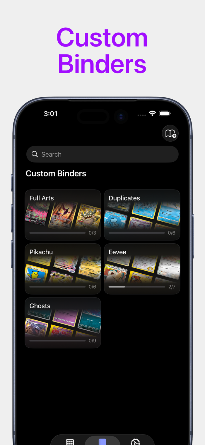 • Create custom binders to track your favourite cards, duplicates, trades, or anything you want
