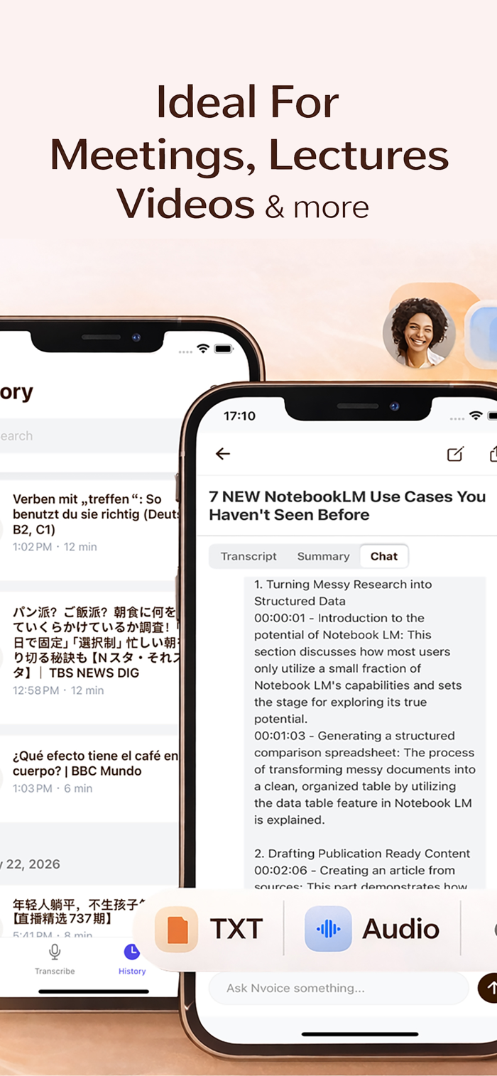 Simply paste a video link or upload a file. Nvoice detects subtitles or transcribes logic to generate: