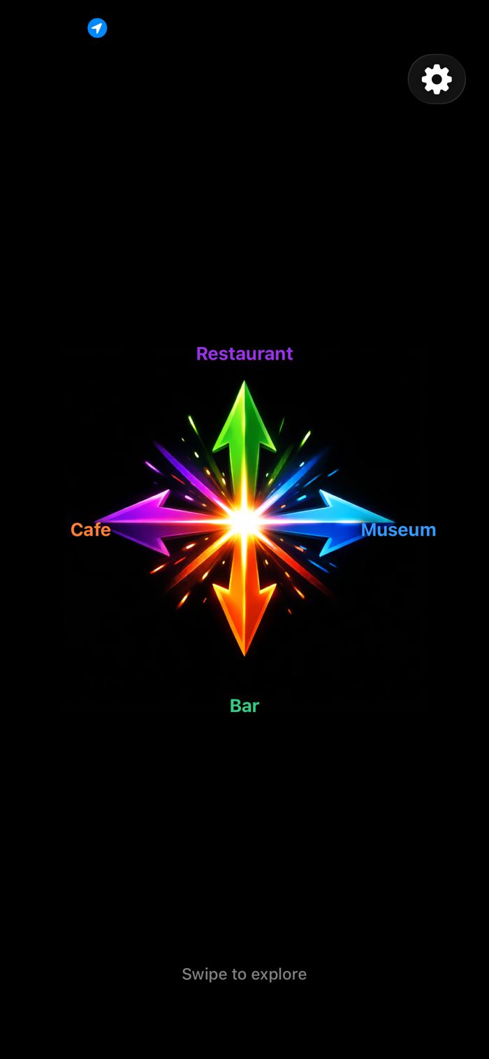 Swipe up, down, left, or right — each direction reveals a different category of places nearby. Browse through beautiful, full-screen cards showing photos, ratings, distance, hours, and more. Found something interesting? Tap to call, visit the website, or get directions in Apple Maps.