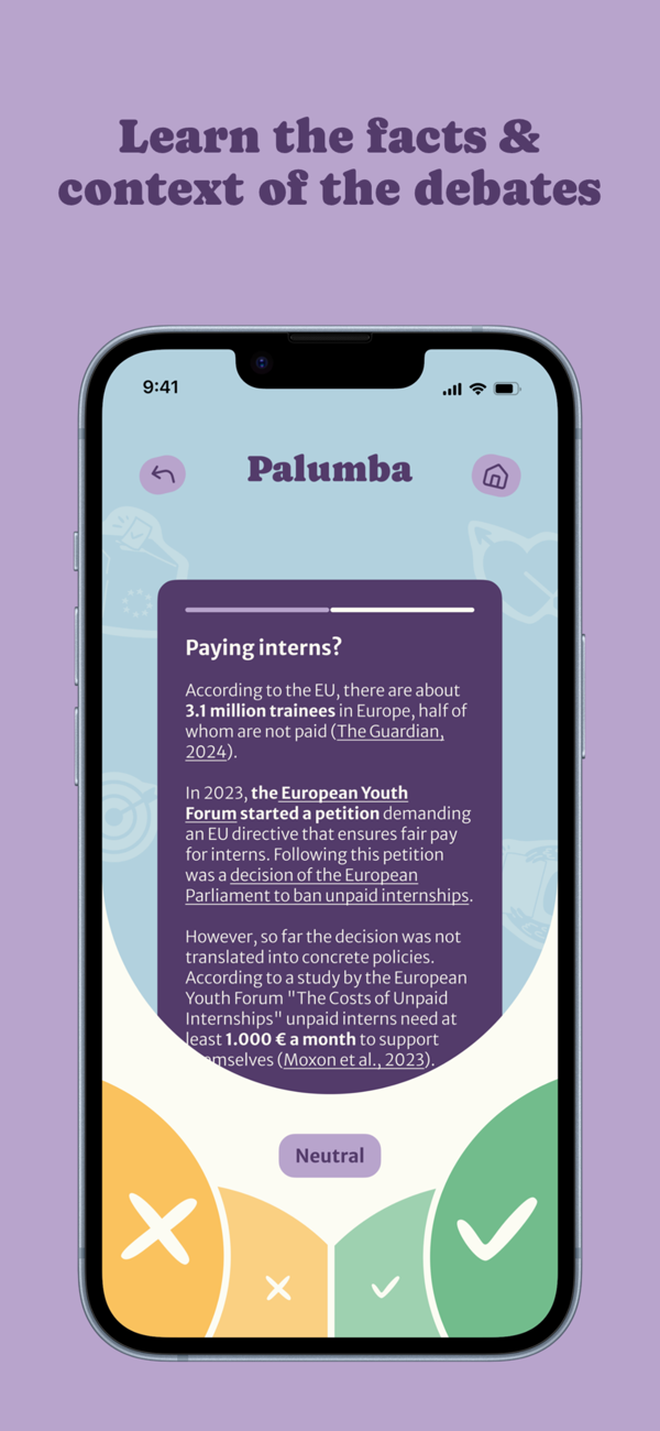 Palumba is a non-profit and non-partisan association of young Europeans who care about our generation taking centre stage in the public debate and vote more than ever. All statements were curated from suggestions of youth organisations, proofread by a pan-european Scientific Council independent from candidates and parties, and evaluated by an open-source algorithm. Strict data protection applies too. We explain (and you can check) everything in our FAQ here: palumba.eu/faq