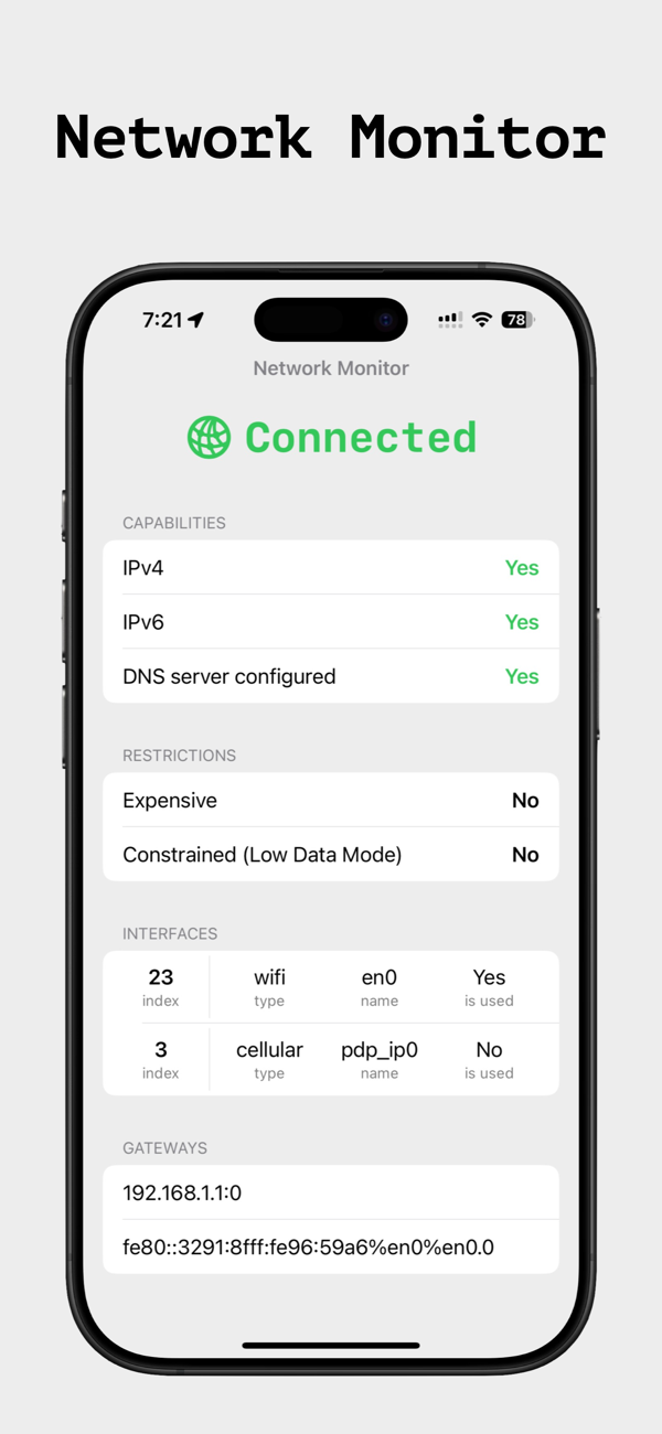 Network Monitor是一款实时连接状态监测工具,适合IT专业人员、旅行者等。核心功能包括:实时状态,即时更新连接状态并监测网络变化;网络能力,支持IPv4和IPv6,检测DNS服务器配置等;接口检测,查看所有可用网络接口及详细信息;高级诊断,提供网关信息、路由细节等。可用于排查连接问题、监测旅行时网络变化。