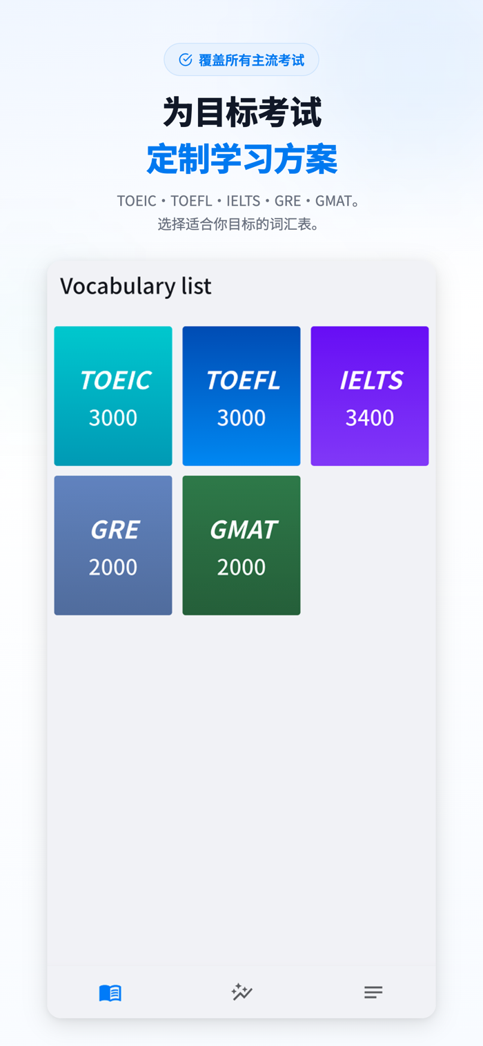 目前,本应用包含针对以下五项考试设计的单词书: