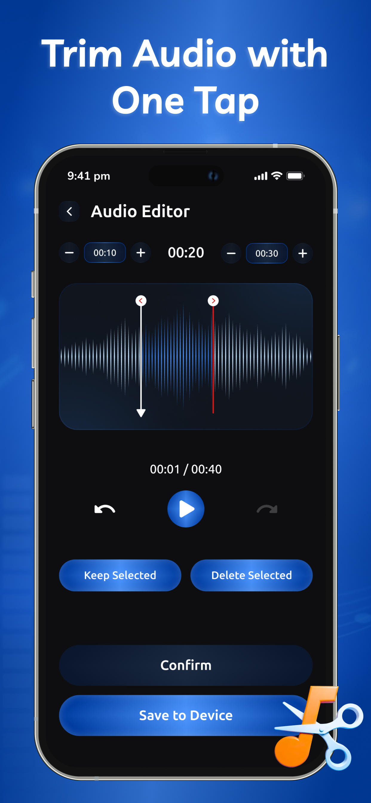 High-precision audio trimmer: select the exact start and end point of an audio file, then trim or cut with ease.