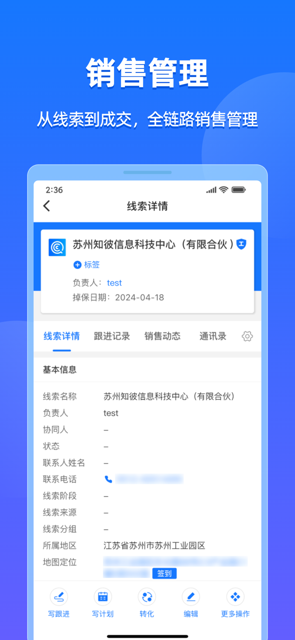 企查查CRM是企查查旗下智能销售管理平台,基于数据安全的灵活可扩展的个性化轻办公CRM。依托海量精准数据落地CRM解决方案,实现以客户为中心的全流程管理,涵盖客户/线索管理、业务协同、交易闭环管理,还有业务定制PaaS平台,能助力企业实现工具、人和业务三维链接,提升沟通协作与工作效率,沉淀交易数据,还能低成本定制数字化方案。客服QQ:4009985212,电话:400-928-2212(工作日9:00-18:00),邮箱:kf@qichacha.com