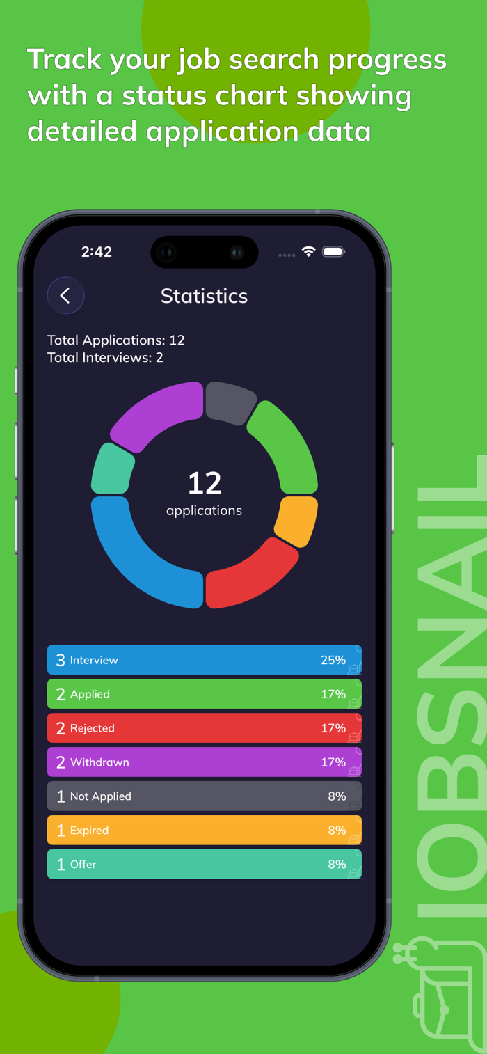 Welcome to Job Applications: JobSnail - your trusted companion for tracking job applications and interviews. A light, native interface nterface helps you organize your job search and allows you to add complete job applications and interviews, and assign statuses, each represented by distinct color codes. This intuitive design ensures that managing your jobs is simple and efficient.