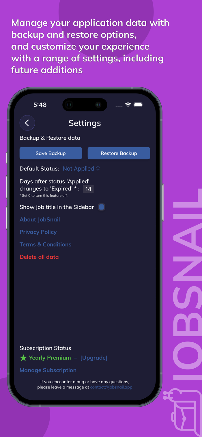 - Data Backup and Restoration: JobSnail offers the option to export your data, ensuring you can back up and restore all your applications effortlessly.