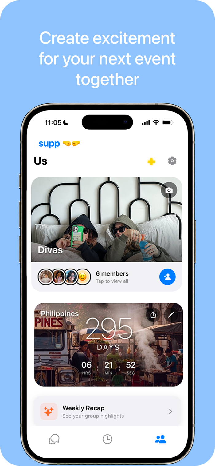The Event Countdown - Stop asking "when are we hanging out?" Pin your next group trip, dinner, or reunion to your Group Vibe page and watch the live countdown tick away. It builds shared anticipation for the moments that actually matter - when you’re together in person.