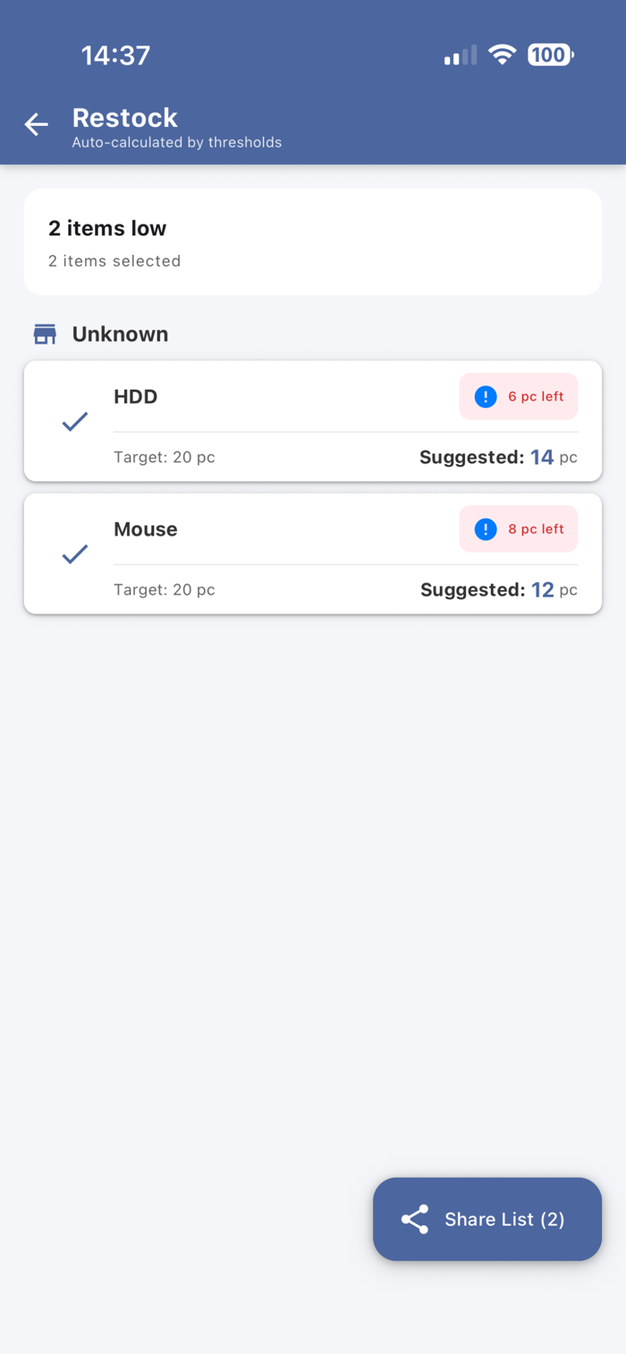 这是一个会帮您思考的工具。为您管理的耗材设置“最低警戒线”和“最高满仓线”。系统会实时监控库存水位,一键计算出当前需要补货的物品和建议数量。直接生成补货清单,复制分享给供应商或采购部门,告别凭感觉订货。