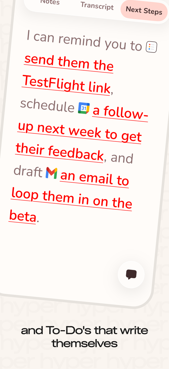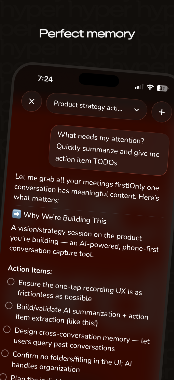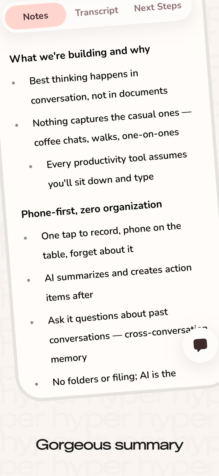 Hyper解决对话易遗漏问题。周一早上一键开启,无需设置工作区、文件夹,对话时随时提问,它能从听过的内容中回答。会议结束没记笔记也无妨,会生成精彩总结、完整转录和自动待办事项。还能按需求重写,周五时所有对话可搜索、行动项被追踪、疑问有解答。