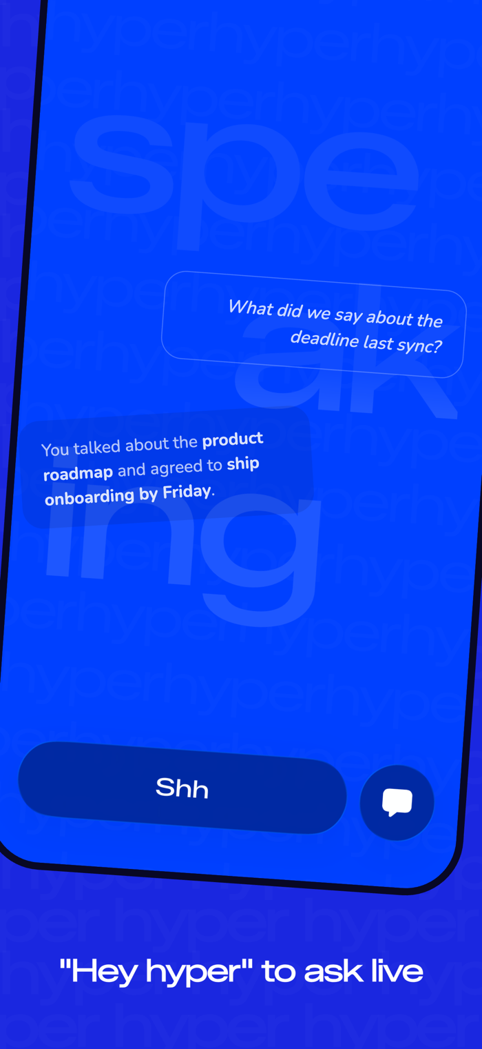 “我们上次同步时说截止日期是什么时候?” 无需动手,随时提问,不打断流程。Hyper会根据它听到的所有内容进行回答。