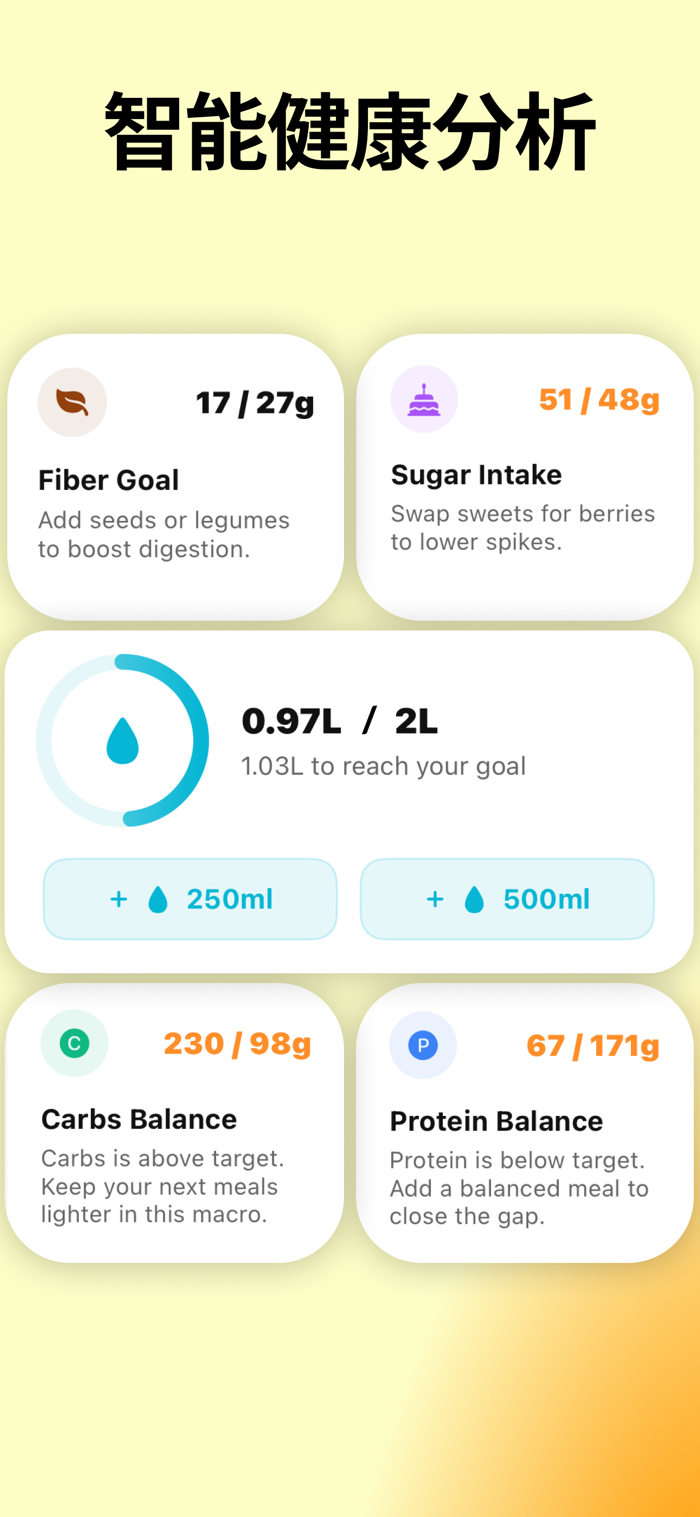 - Apple 健康同步:将营养数据与你的活动及睡眠相结合,获取个性化洞察。