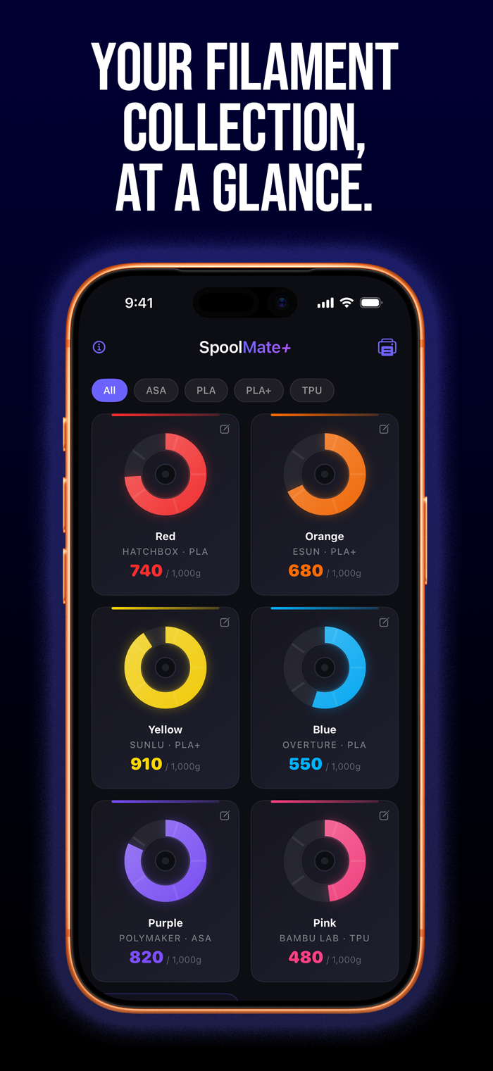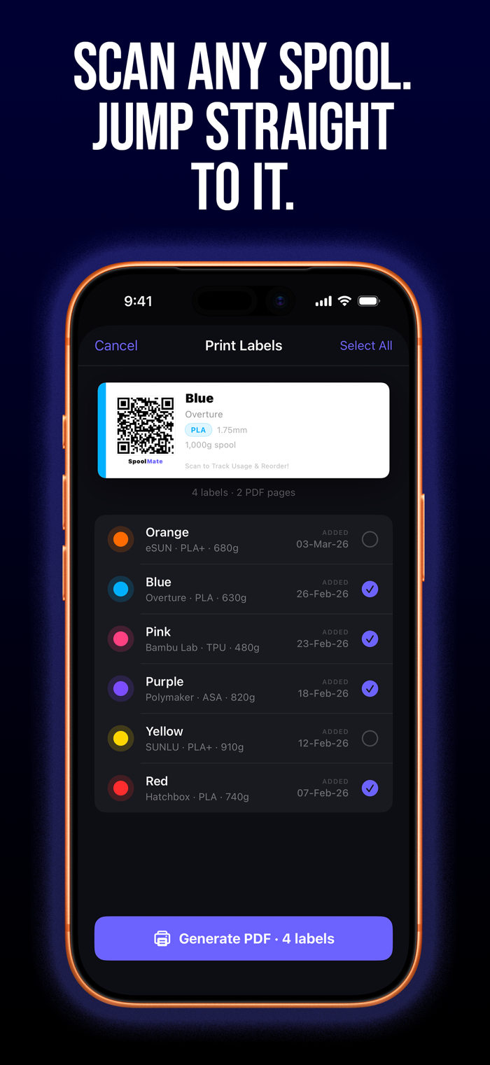 • Scan QR labels to jump straight to any spool (SpoolMate+)